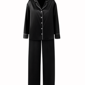 This luxurious and elegant pajama set is crafted from high-quality 19-momme silk. It features a classic yet modern style, accentuated by white piping. The fabric is exceptionally soft, smooth to the touch, and has a subtle natural sheen.