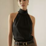 An elegant silk top that combines subtle sophistication with modern style. Crafted from the finest quality silk, it delights with its softness and gentle sheen that beautifully highlights every movement. The top features a delicate draped neckline and refined back detailing with a subtle tie accent, adding a touch of uniqueness. Long, slightly flared sleeves provide comfort and a sense of lightness. A perfect choice for elegant outings, evening events, or formal occasions. Pair it with classic trousers or a skirt to create a timeless look.