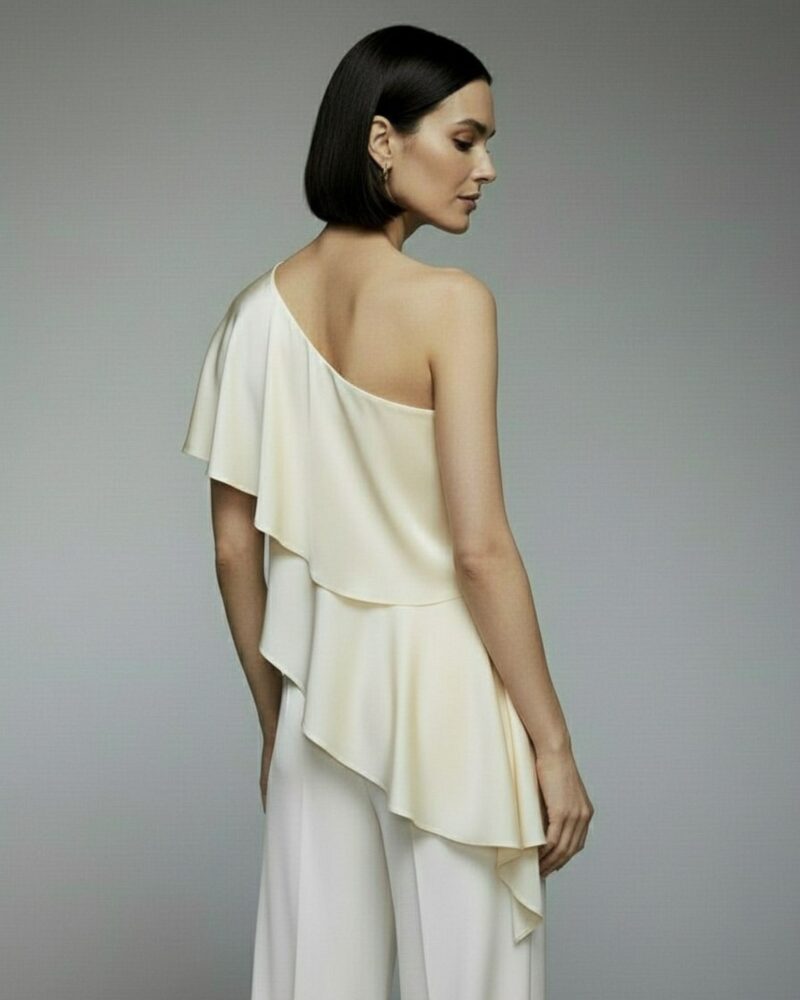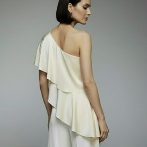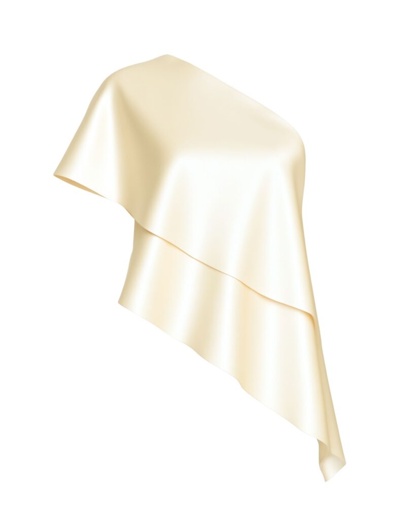 The GAIA silk blouse captivates with its asymmetric one-shoulder design and double-layered wave that gently drapes over the silhouette. Crafted from 100% natural silk, it features a subtle sheen that adds a refined touch to any outfit.