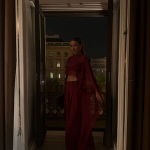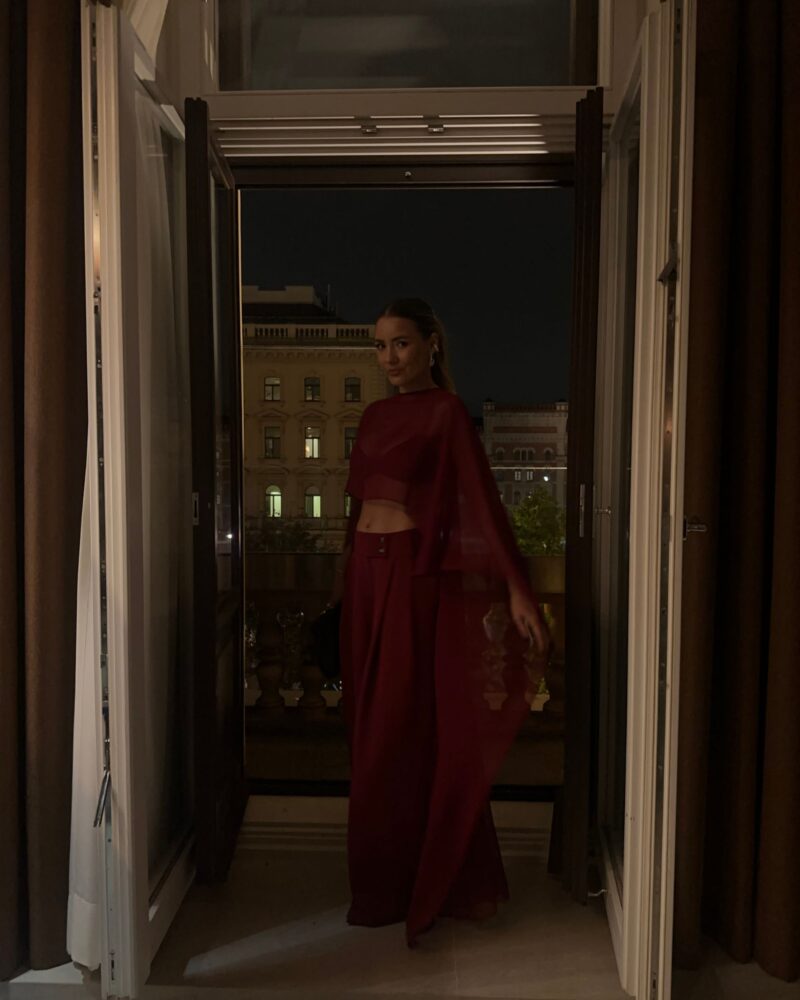 This flowing cape made of the highest quality silk georgette is the epitome of lightness and elegance. The gently flowing fabric adds a touch of lightness to the silhouette, creating a romantic, airy effect.