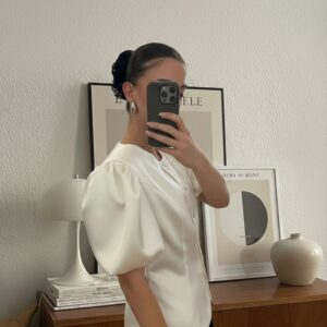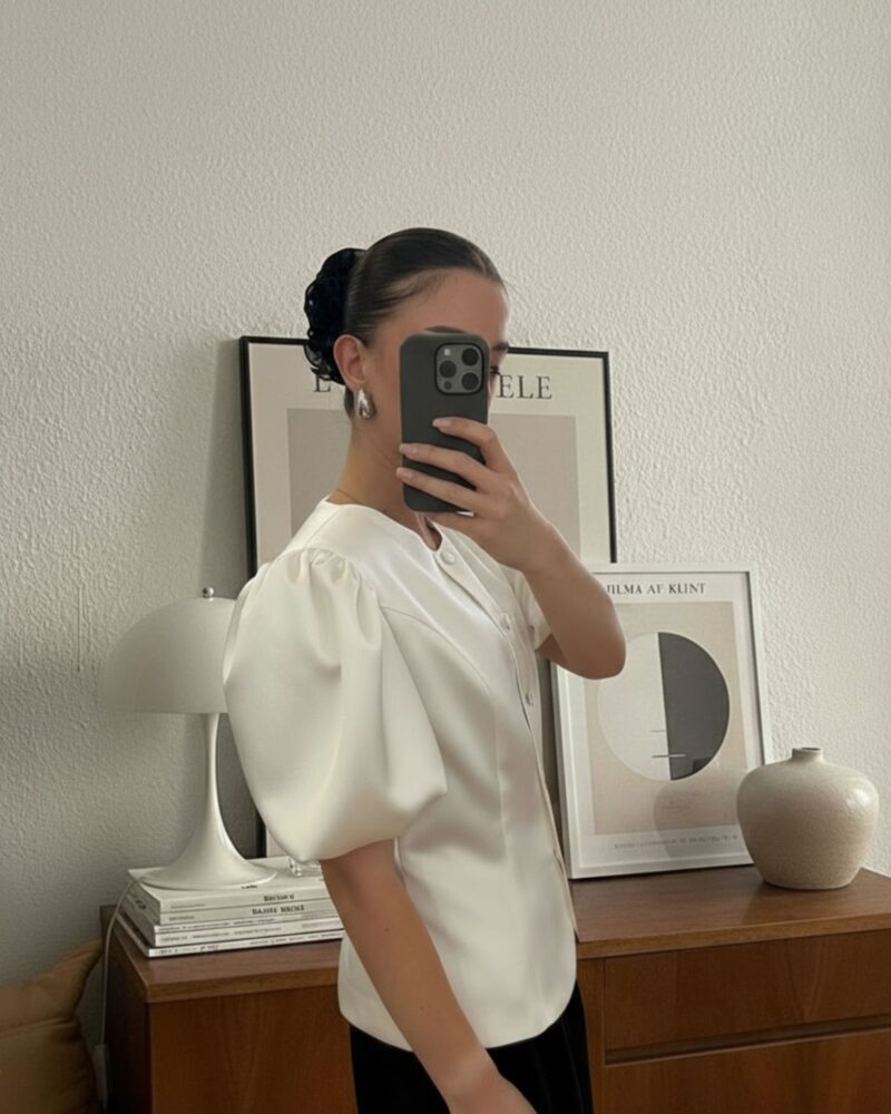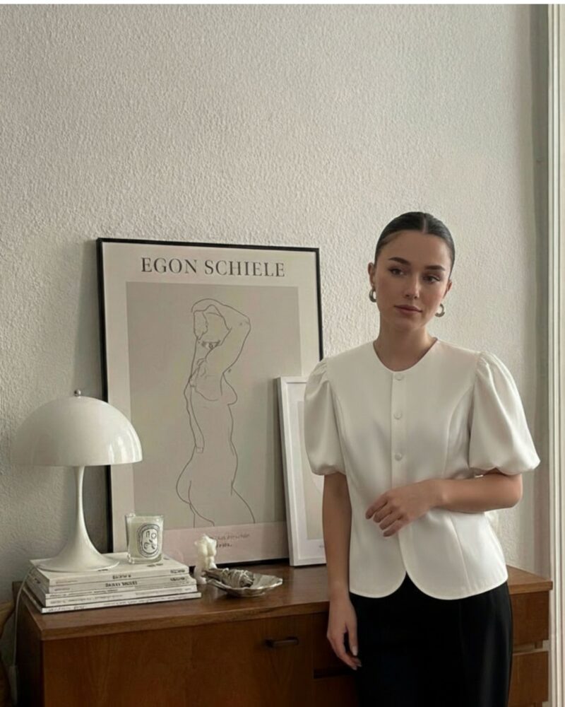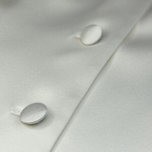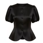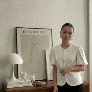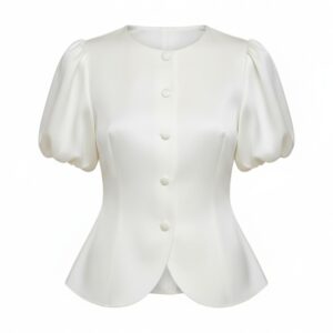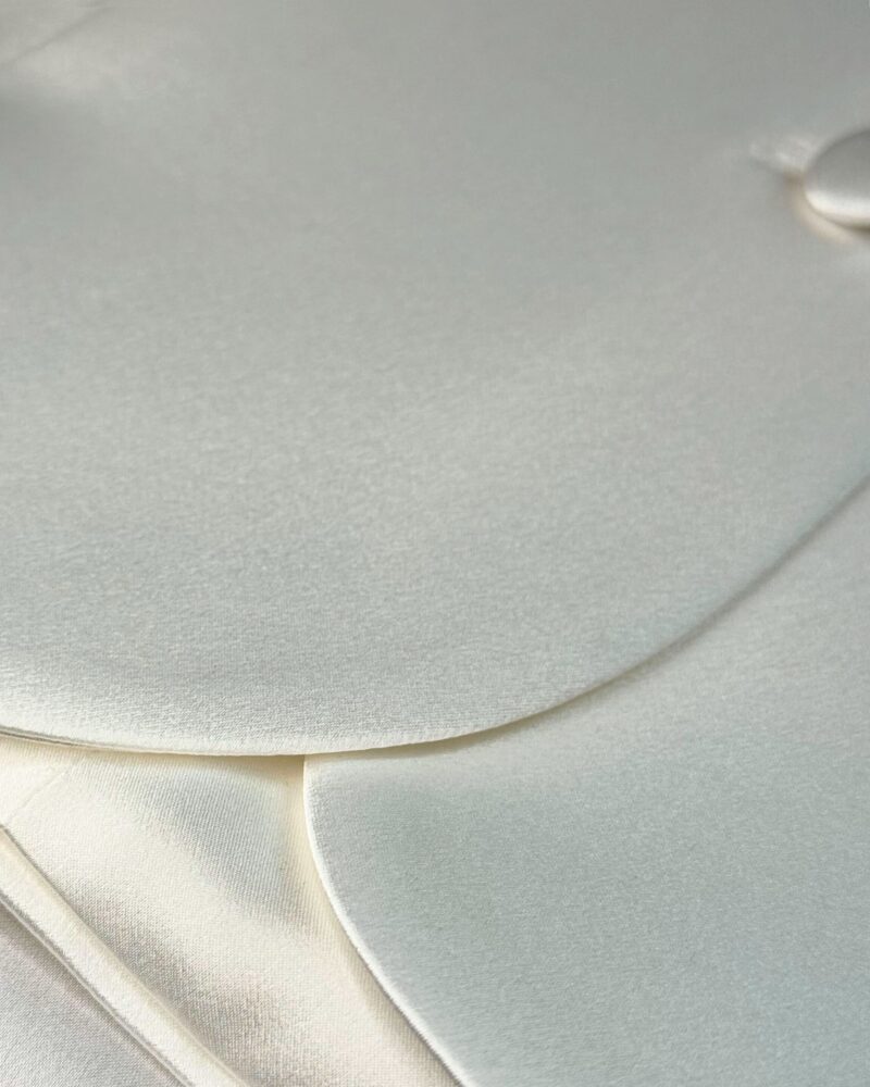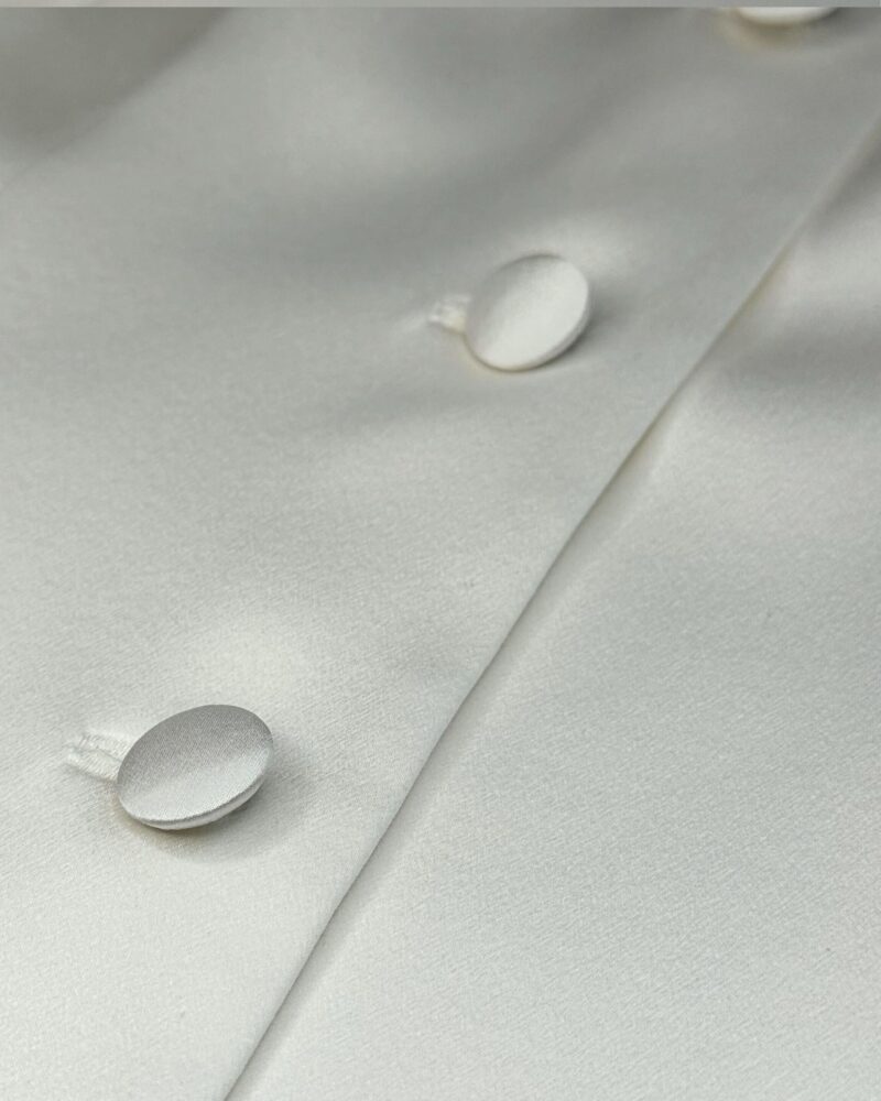 An elegant blazer crafted entirely from luxurious silk taffeta, featuring a subtle sheen and impeccable tailoring. This model with short, slightly puffed sleeves and silk-covered buttons perfectly blends classic style with modern elegance. The fitted cut beautifully accentuates the waist, while the gently rounded hem adds lightness and sophistication.