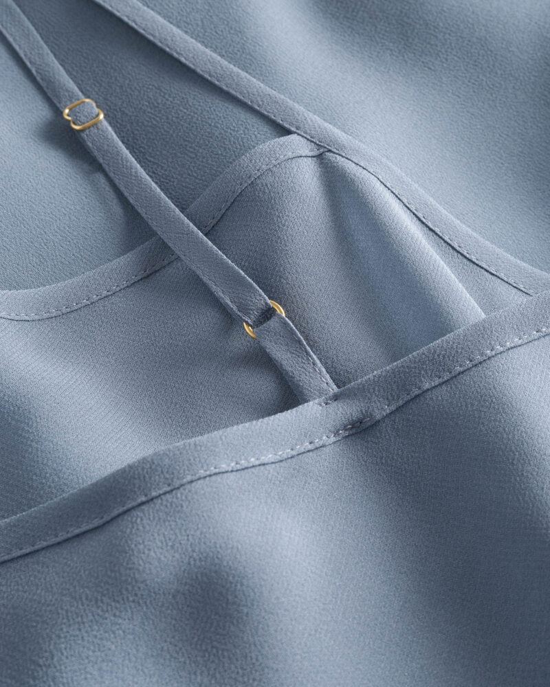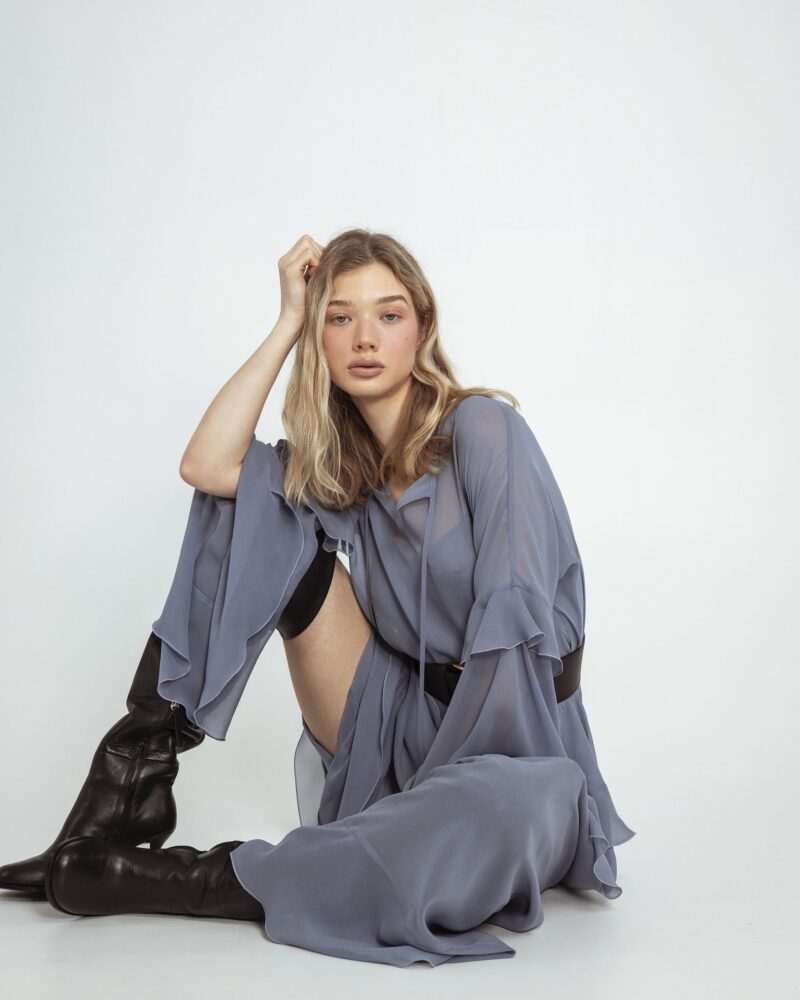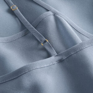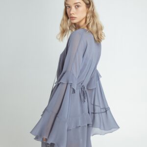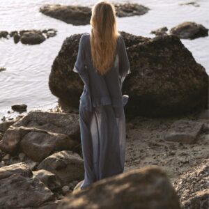 The neckline is finished with thin strings that you can wear in two ways – tied for a more romantic look or loosely let down for casual elegance. There is also a belt made of the same material that allows you to emphasize the waist, adapting the dress to your figure.