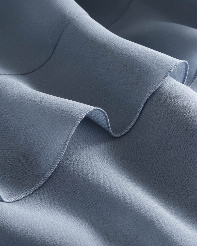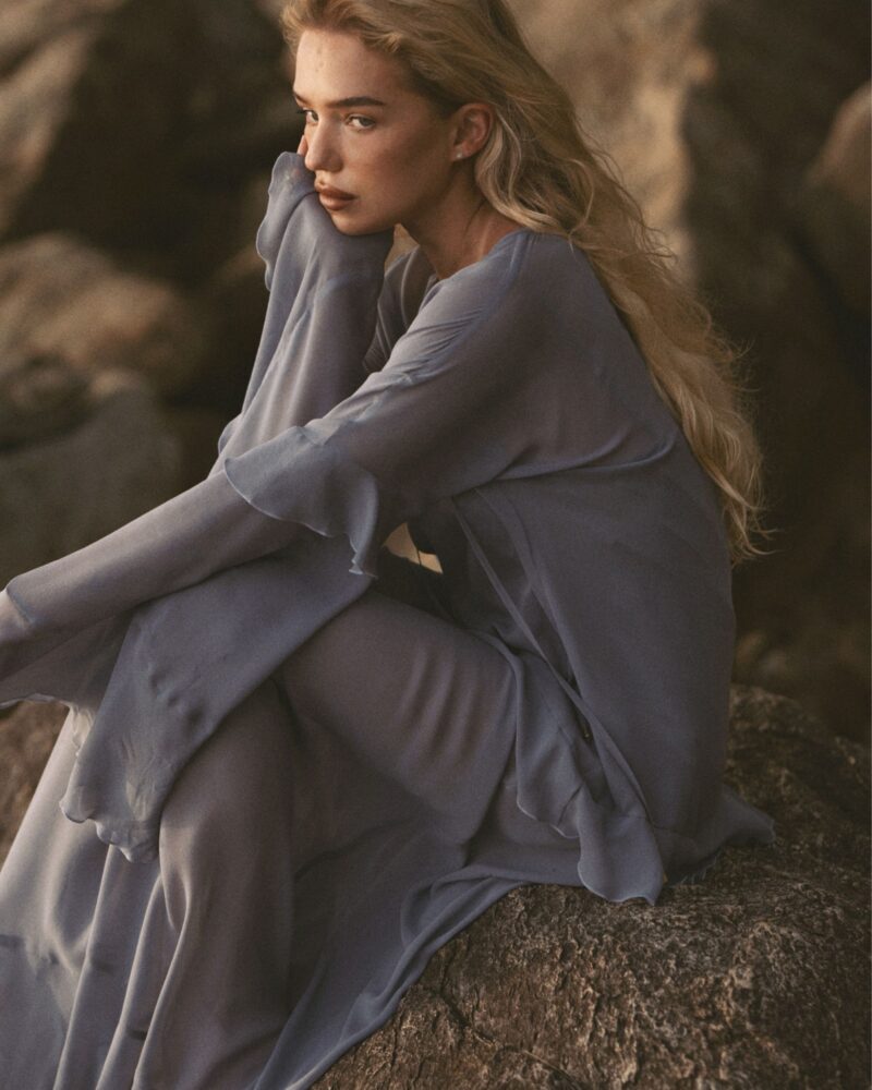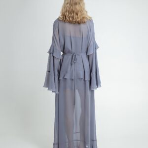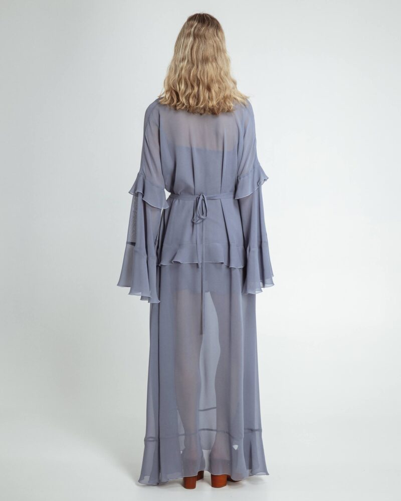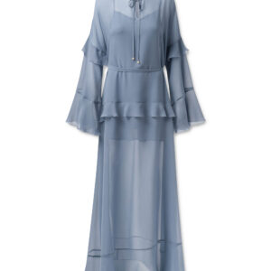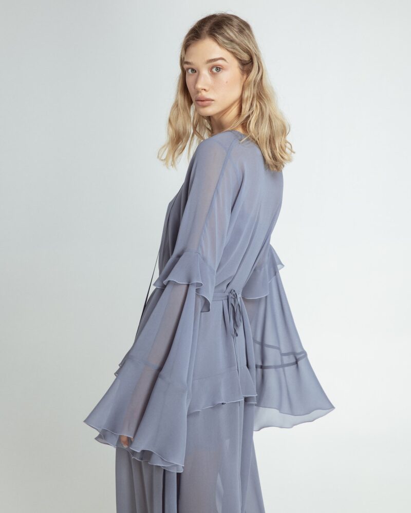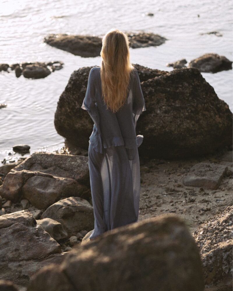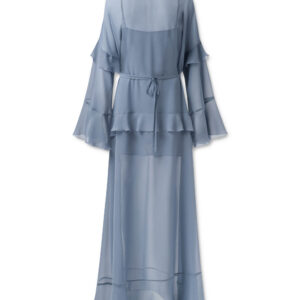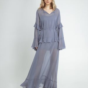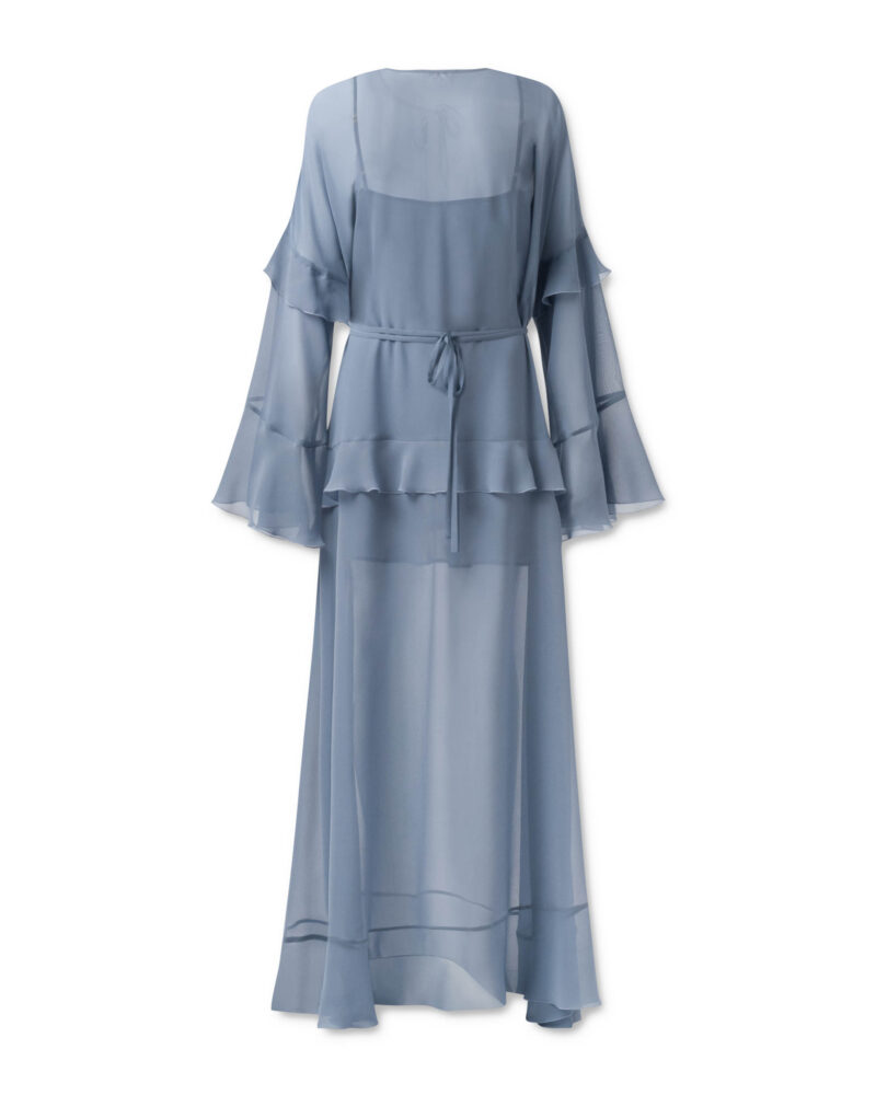 The Riviera long dress made of silk georgette is the epitome of airiness and subtle elegance. It comes in a dark blue shade that adds class, and the delicate ruffles on the sleeves and skirt create a beautiful, light movement with every step.