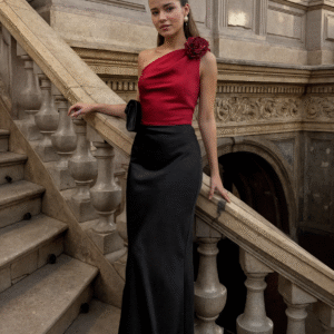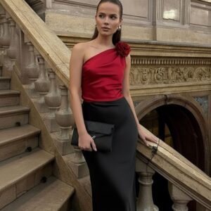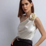 Elegant one shoulder silk top with ruffle detail and 3D silk rose.