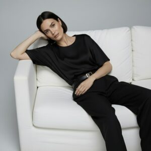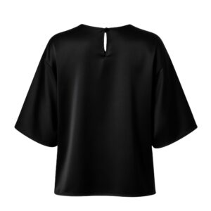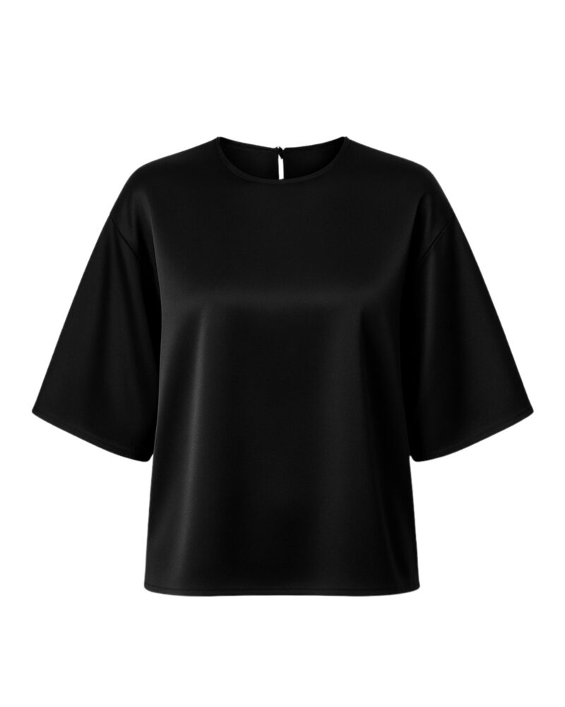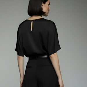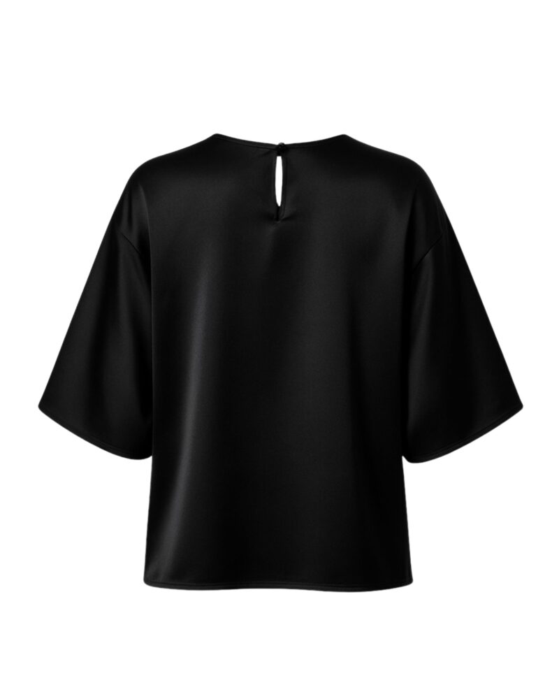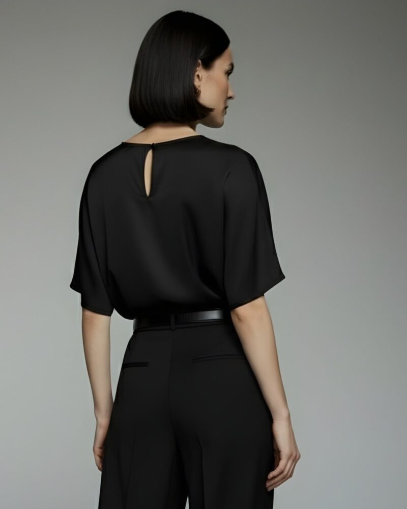 Exceptionally soft and subtly lustrous, this blouse is crafted from 100% premium silk satin. The relaxed, boxy silhouette gently skims the body, while the elbow-length wide sleeves add a modern sense of ease. A delicate back slit with a tiny loop and button fastening ensures effortless wear while remaining an understated detail.