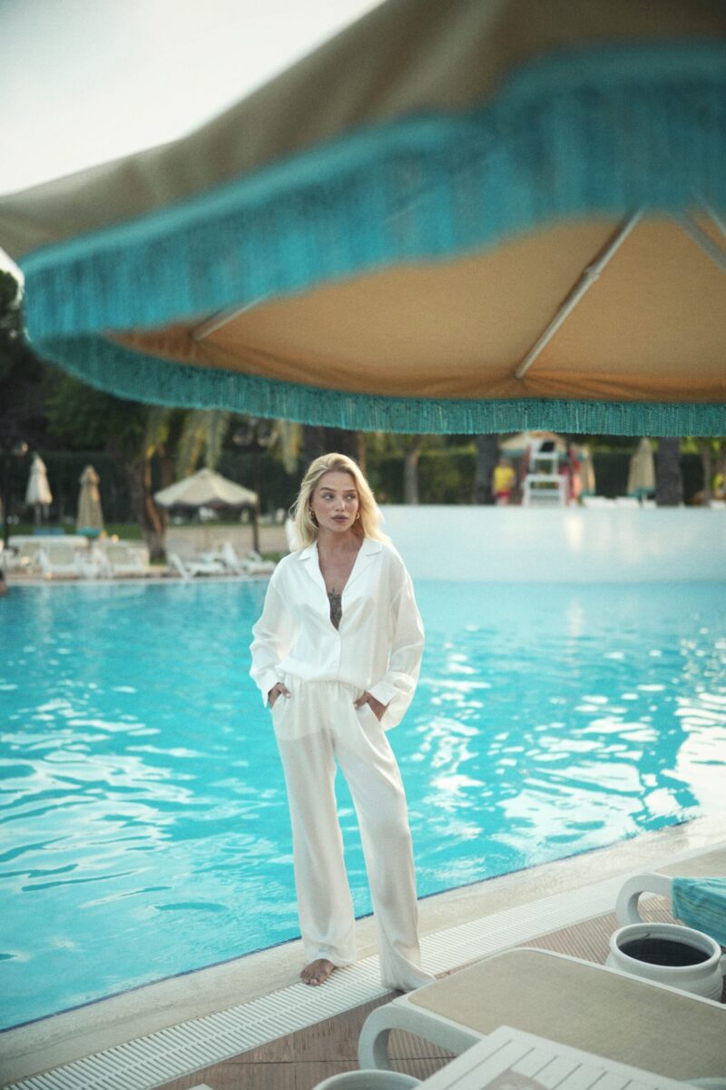 Stylish, silk pants with a pajama cut. They have a high waist, loose legs, a wide and comfortable elastic waistband, and pockets. The pants make a perfect set with the SUNRISE shirt, referring to the still fashionable pajama style. You can safely wear this set every day with your favorite shoes – sneakers or flip-flops. They will also work great with a simple, white T-shirt or a striped top.