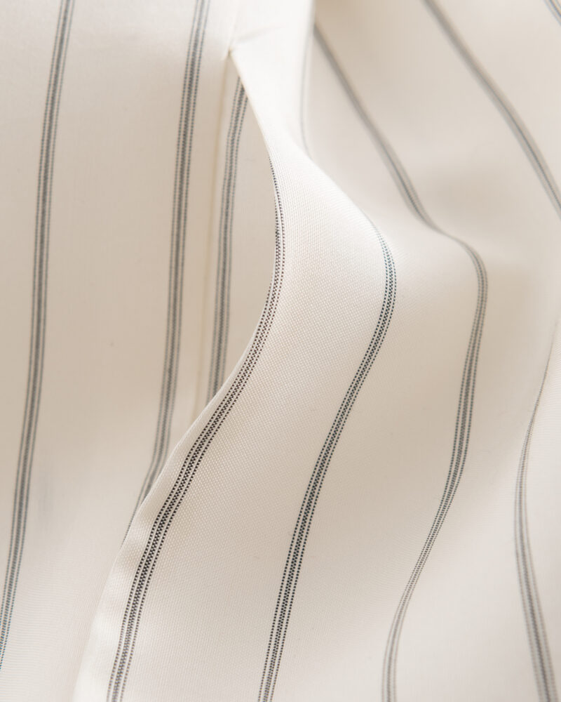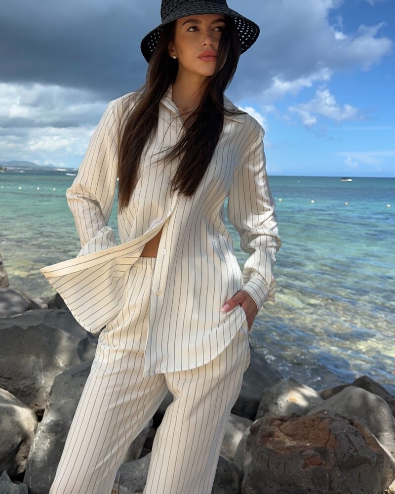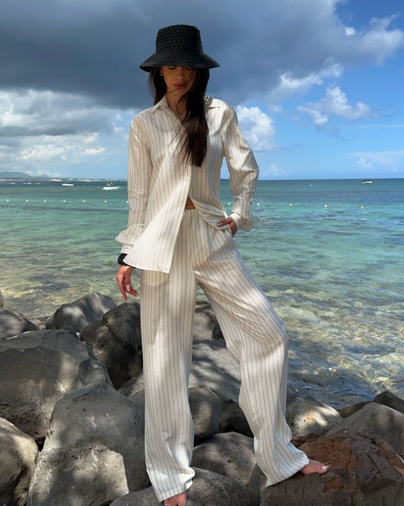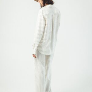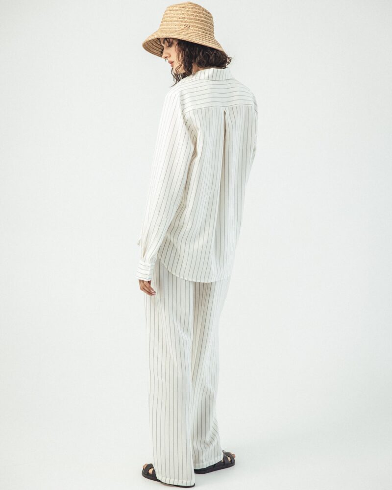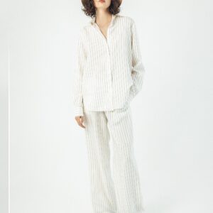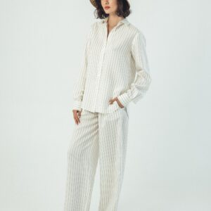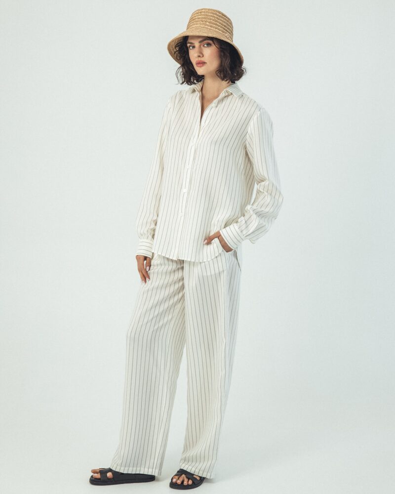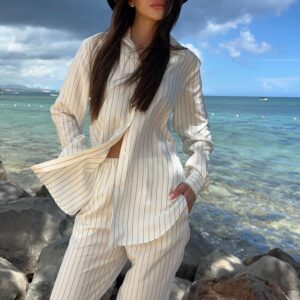 Discover our exceptional Sunset collection – the essence of summer elegance that will surprise you with its unique style. These fashionable trousers in a subtle ecru shade, broken up by delicate gray stripes, harmoniously combine classic style with modern design. Every detail of these trousers has been designed with comfort and aesthetics in mind. The fitted waistband, thanks to an elastic waistband, ensures not only a perfect fit but also comfort in everyday wear. The silk material guarantees lightness and breathability, making them an ideal choice for both special occasions and everyday wear on hot days.