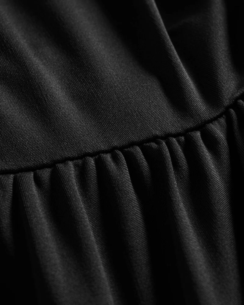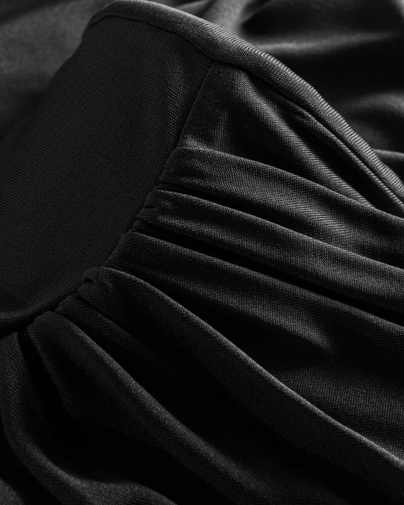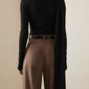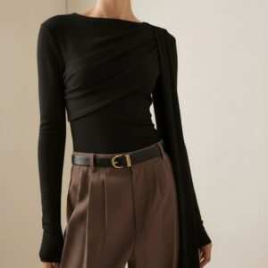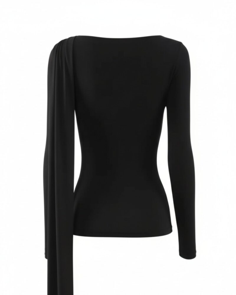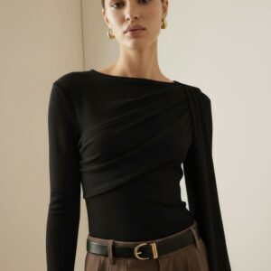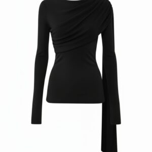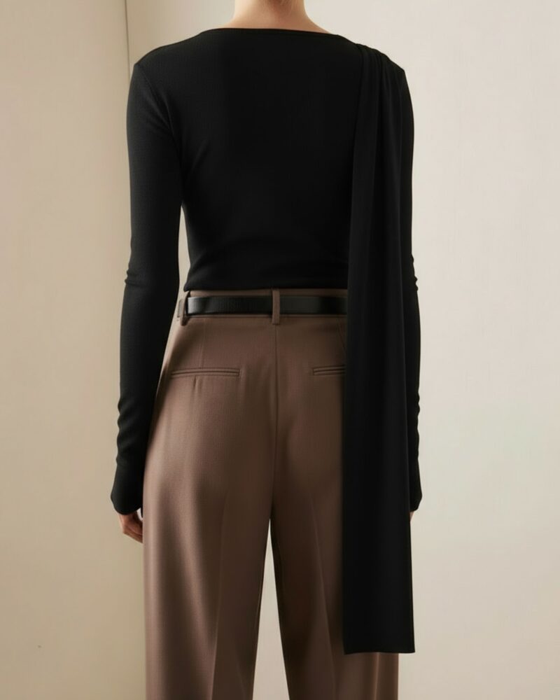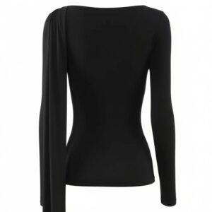 Elegancka, miękko układająca się bluzka z dzianiny z naturalnego jedwabiu. Asymetryczne drapowanie od ramienia modeluje linię biustu i talii, a długi, opadający panel nadaje stylizacji biżuteryjny charakter. Smukła sylwetka, gładkie wykończenie i subtelny połysk jedwabiu sprawiają, że to idealny top na dzień i wieczór.