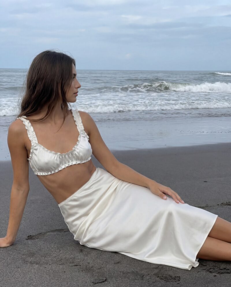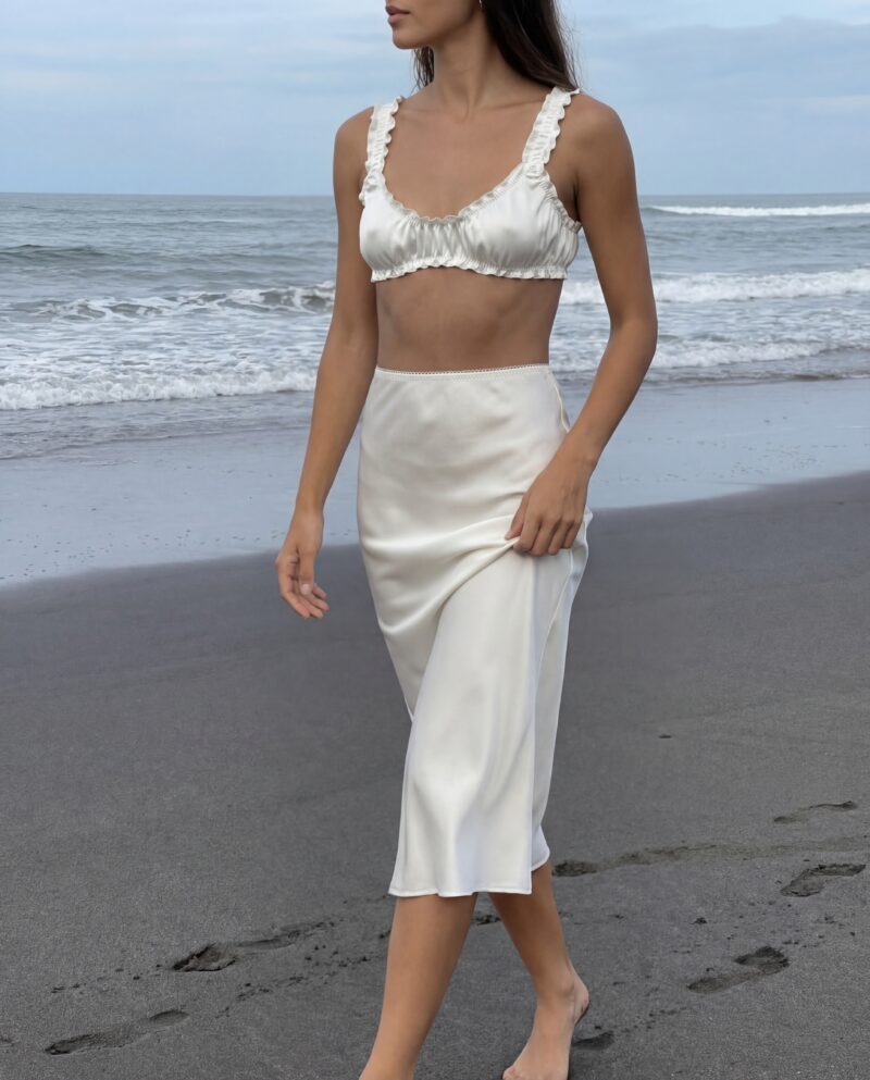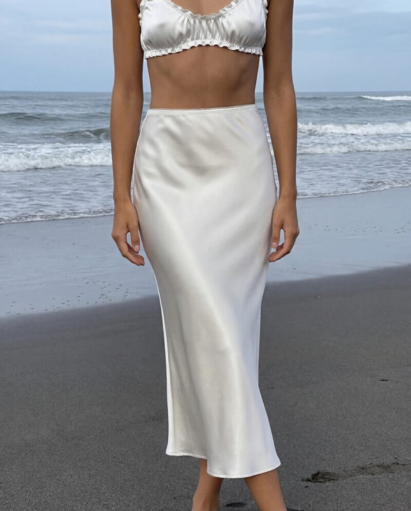 Długa spódnica uszyta z grubego jedwabiu o gramaturze 30 momme.