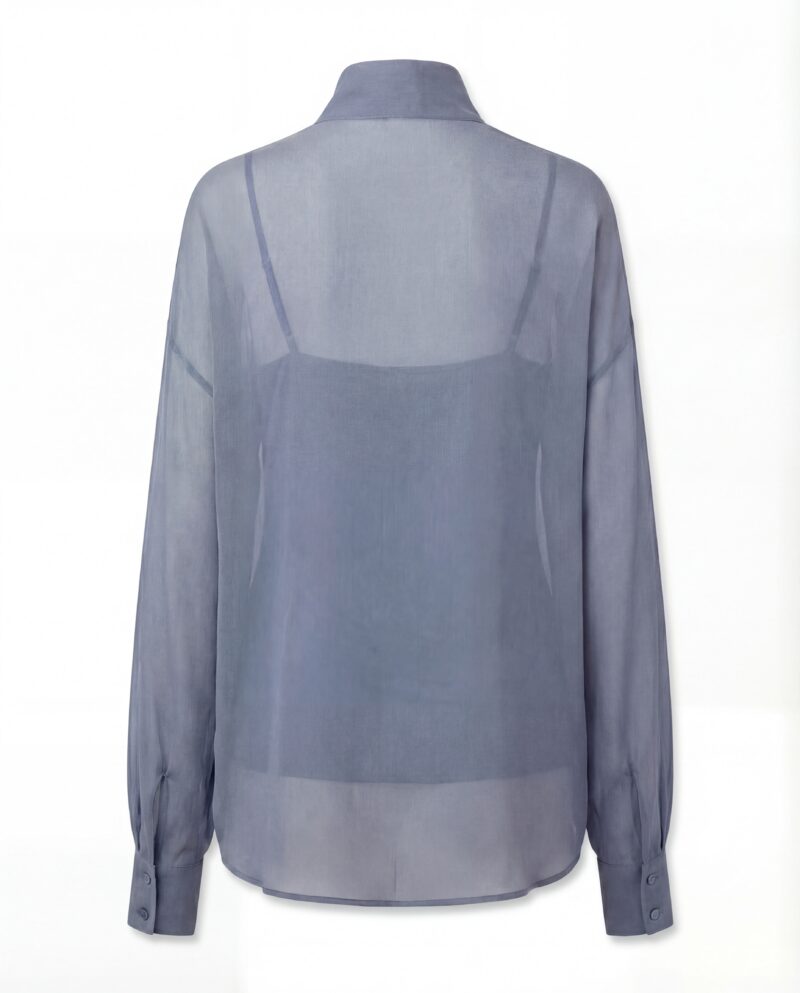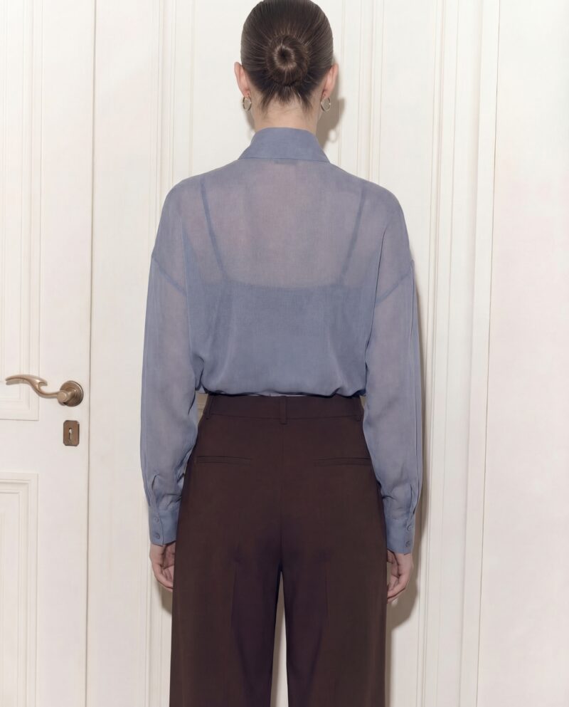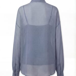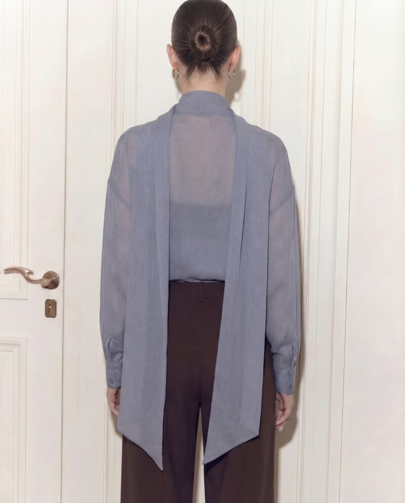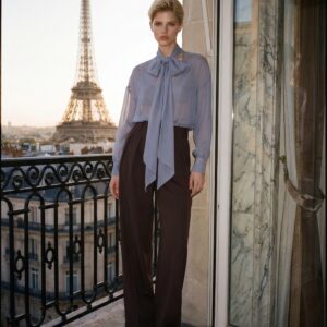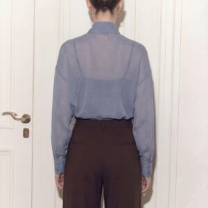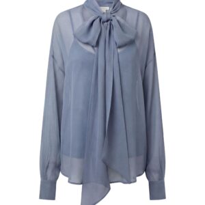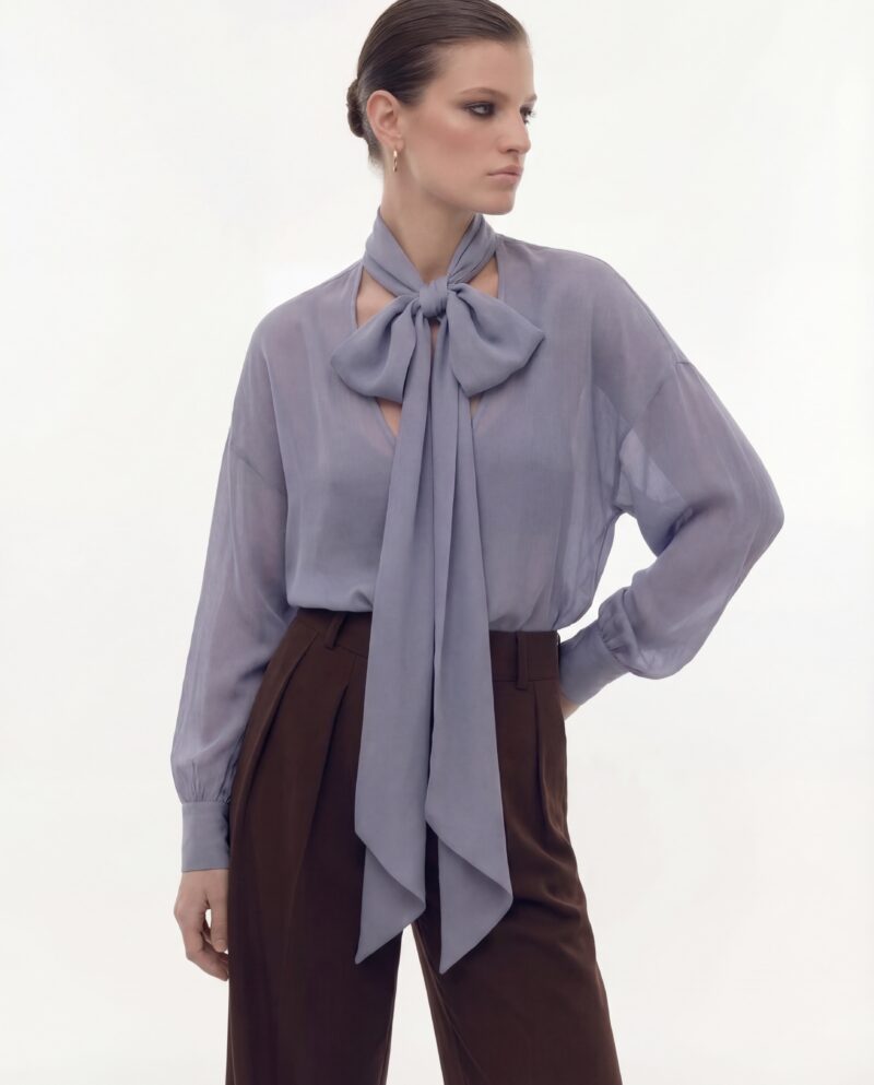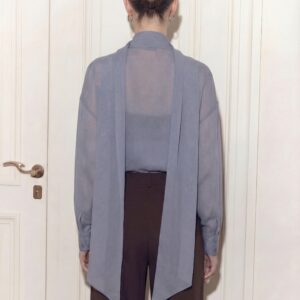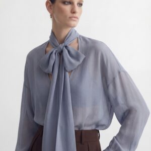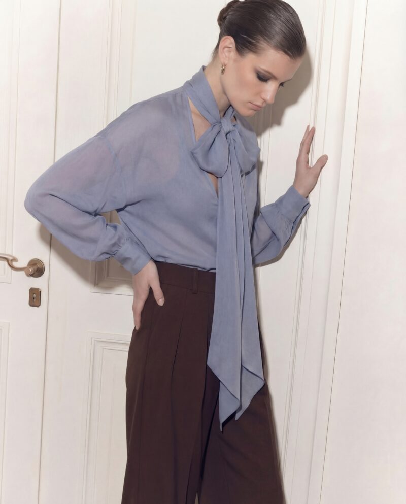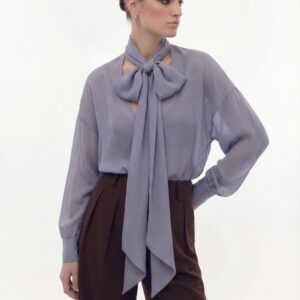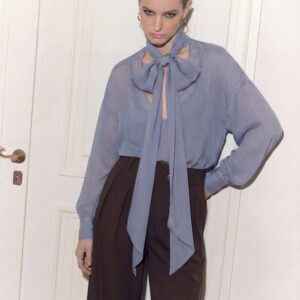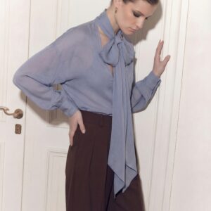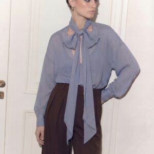Lekka, eteryczna i niezwykle kobieca. Ta jedwabna bluzka została uszyta z delikatnego, półtransparentnej, jedwabnej żorżety, która miękko układa się na sylwetce i pięknie pracuje w ruchu. Charakterystyczne wiązanie przy szyi nadaje jej wyrafinowany charakter i pozwala stylizować ją na wiele sposobów — od swobodnego luzu po elegancką formę z kokardą.