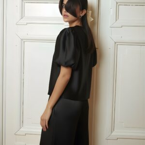 Jedwabna tafta, zastosowana na zewnątrz bluzki, to luksusowa tkanina, która zachwyca swoim eleganckim wyglądem i charakterystycznym, delikatnym połyskiem. Jest to materiał o zwartej strukturze i lekko sztywnym chwycie, który sprawia, że pięknie układa się na sylwetce, tworząc subtelne fałdy i objętość.