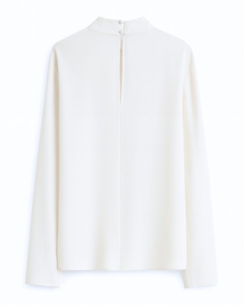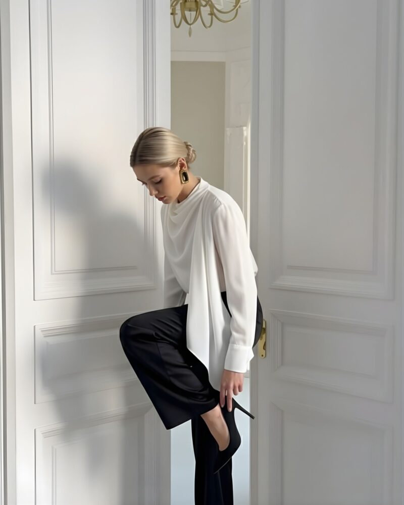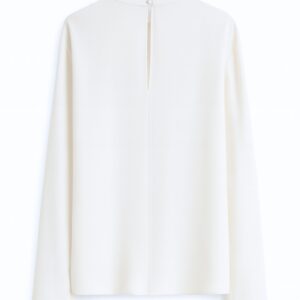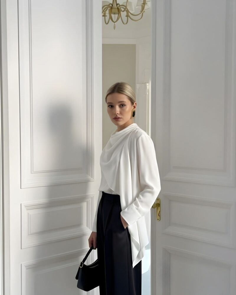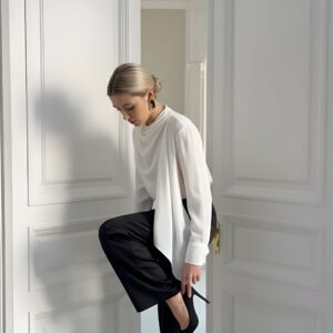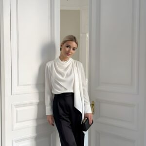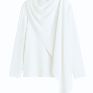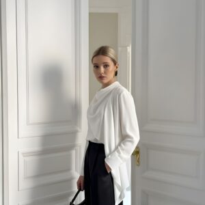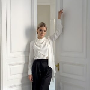 Minimalistyczna, a zarazem niezwykle wyrafinowana bluzka uszyta ze 100% jedwabnej krepy. Jej lekko matowa faktura i delikatna miękkość nadają całości luksusowego charakteru, a asymetryczne drapowanie przy dekolcie pięknie układa się na sylwetce, dodając subtelnej lekkości i nowoczesnej formy.