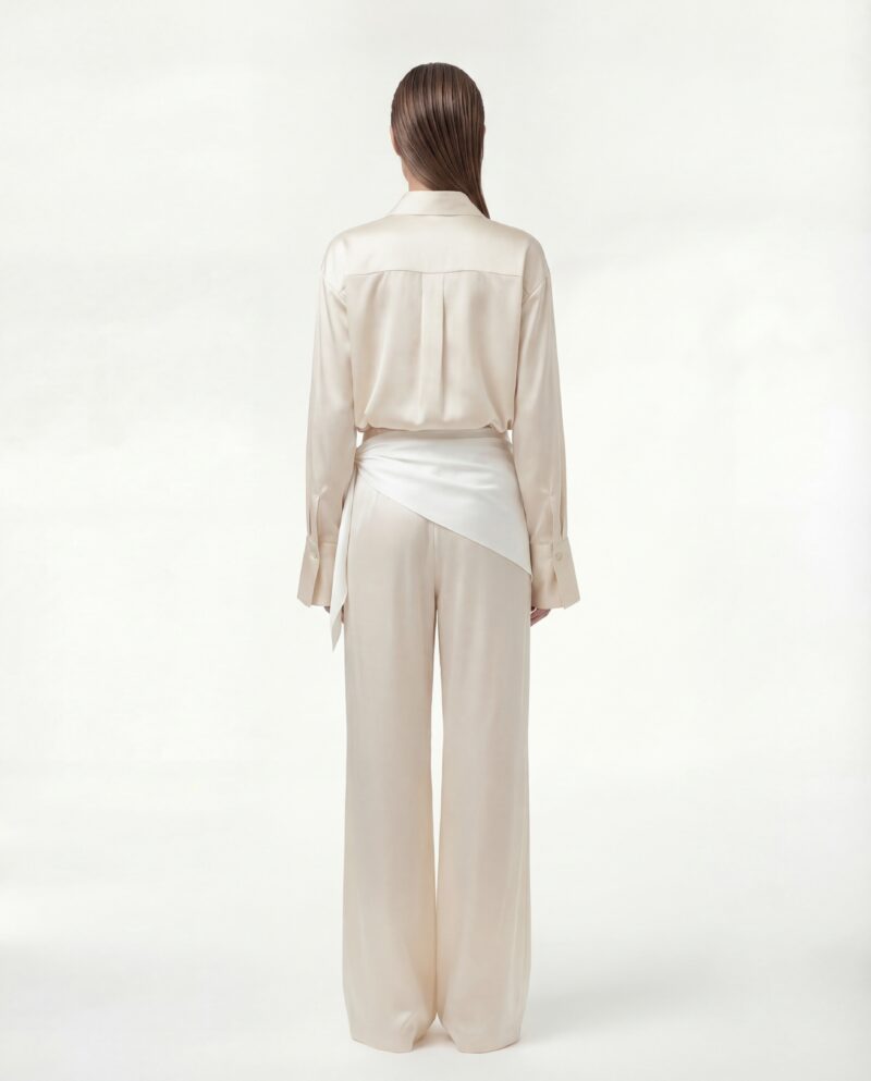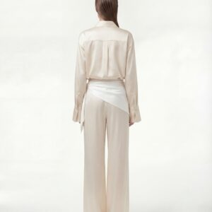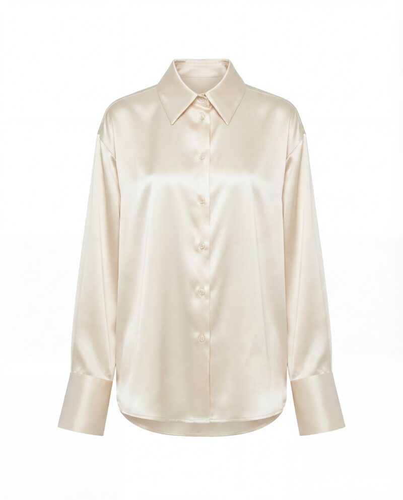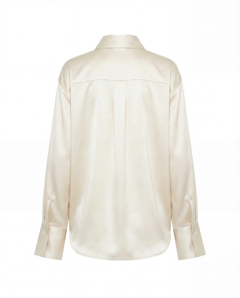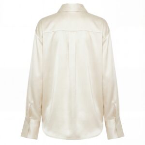 Klasyczny kołnierz i delikatnie wydłużone mankiety nadają koszuli wyrafinowany charakter, a subtelny połysk materiału pięknie pracuje w ruchu i świetle. Luźny krój pozwala nosić ją zarówno w stylizacjach formalnych, jak i bardziej zmysłowych — rozpiętą, nonszalancko wsuniętą w spodnie lub zawiązaną w pasie.