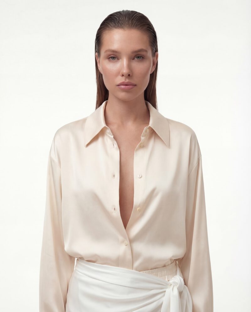 edwabna koszula Silence to esencja nowoczesnej elegancji w najbardziej minimalistycznym wydaniu. Uszyta z luksusowej, lejącej jedwabnej satyny, miękko układa się na sylwetce, tworząc efekt swobodnej, kontrolowanej formy.