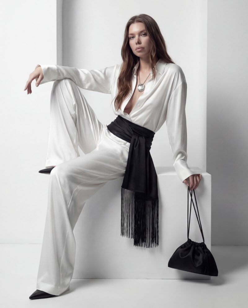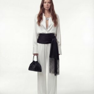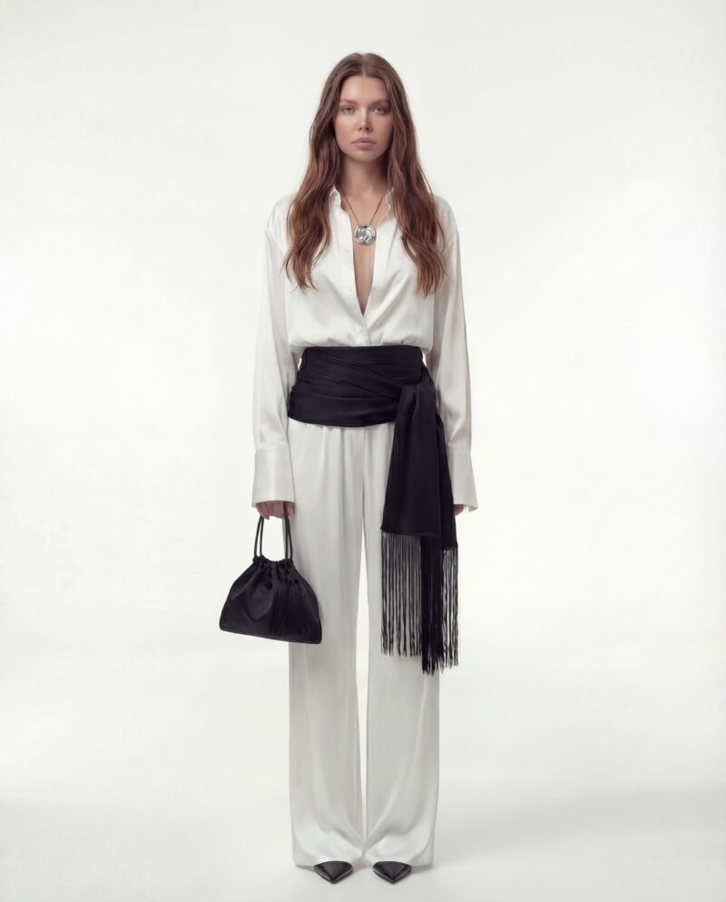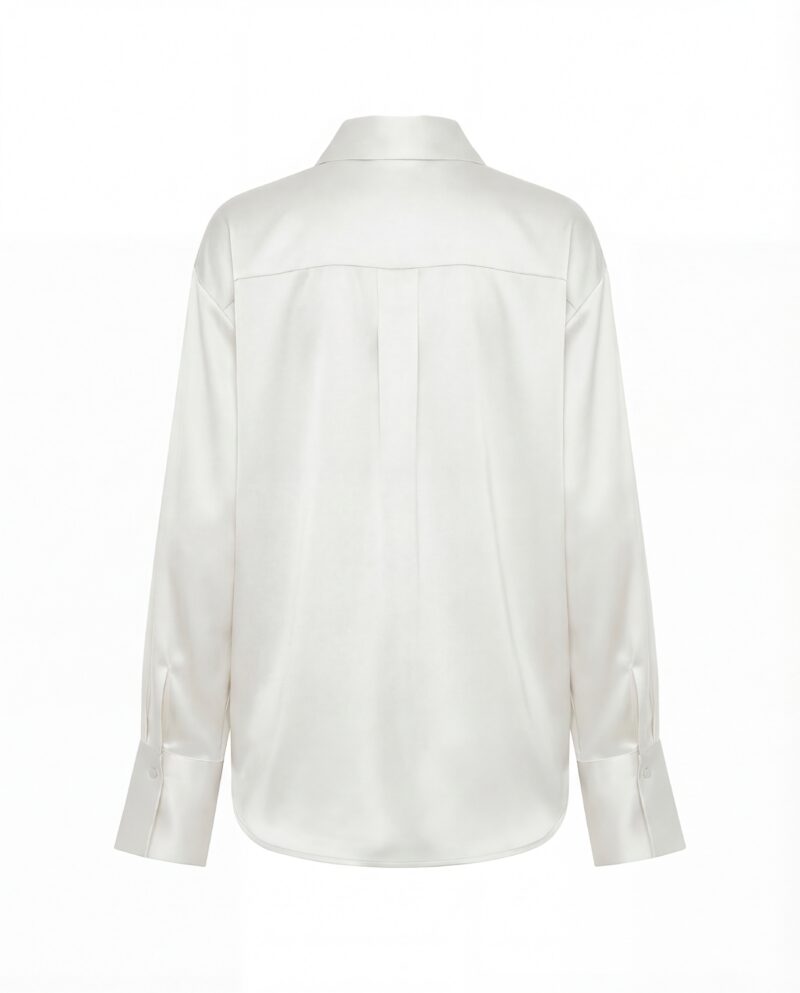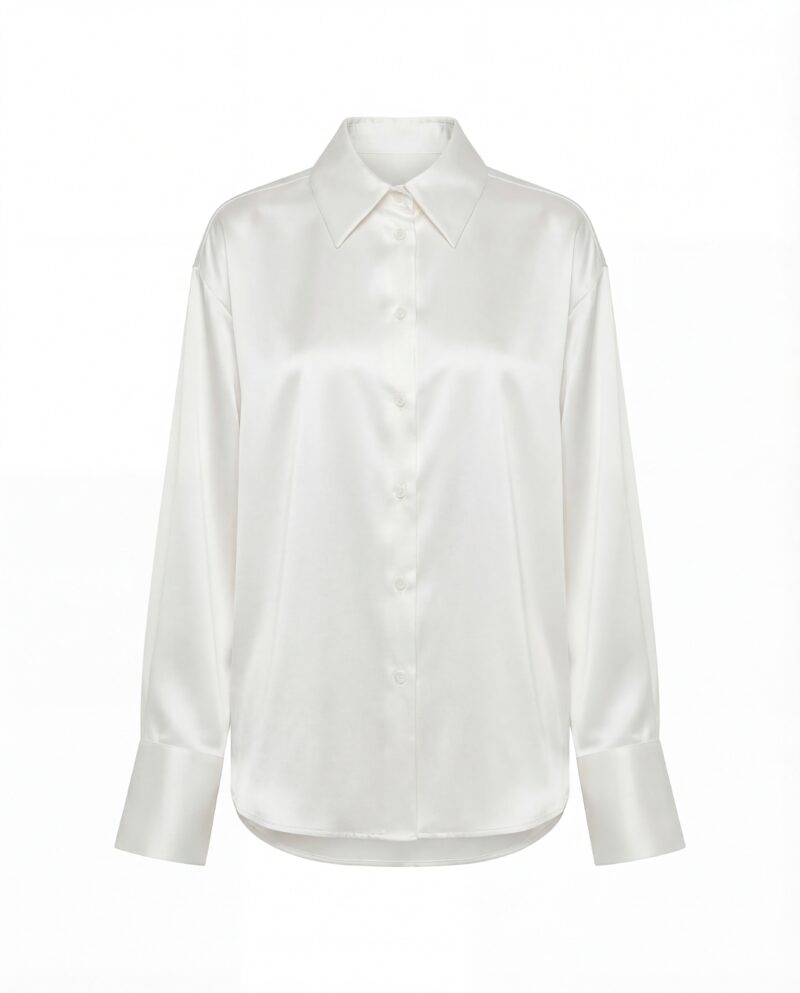 Klasyczny kołnierz i delikatnie wydłużone mankiety nadają koszuli wyrafinowany charakter, a subtelny połysk materiału pięknie pracuje w ruchu i świetle. Luźny krój pozwala nosić ją zarówno w stylizacjach formalnych, jak i bardziej zmysłowych — rozpiętą, nonszalancko wsuniętą w spodnie lub zawiązaną w pasie.