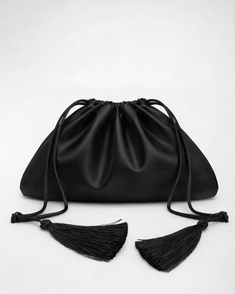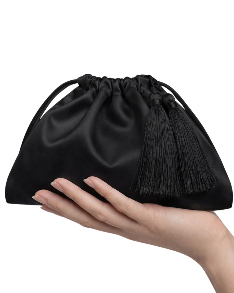 Wykonana z ciężkiej, luksusowej satyny. Możesz nosić ją w dłoni jako kopertówkę lub wygodnie na nadgarstku.