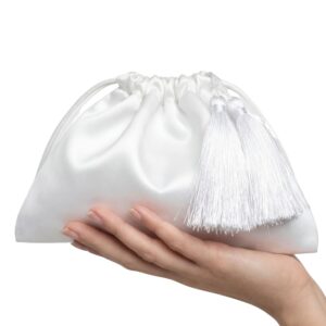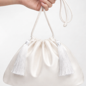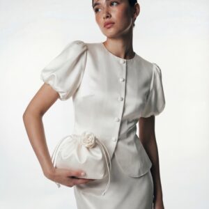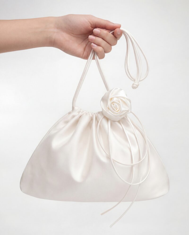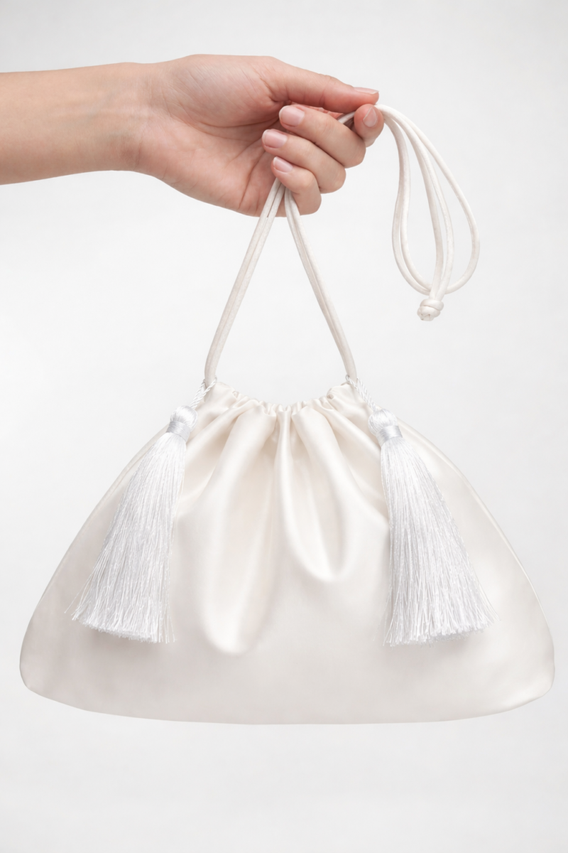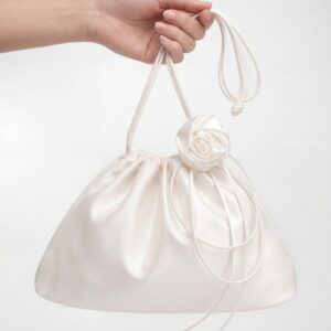 Wykonana z ciężkiej, luksusowej satyny w odcieniu ecru. Możesz nosić ją w dłoni jako kopertówkę lub wygodnie na nadgarstku.