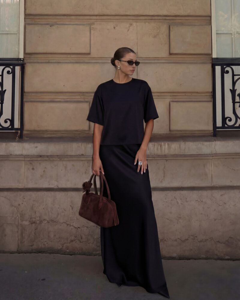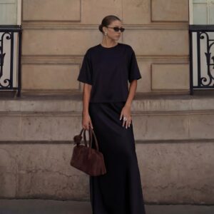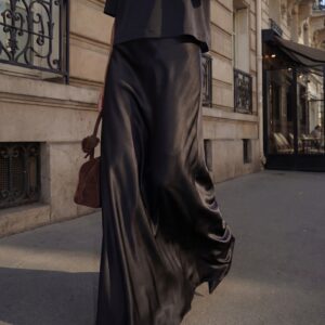 Materiał miękko otula sylwetkę, ale jednocześnie zachowuje strukturę — dzięki czemu spódnica doskonale się układa, nie prześwituje i nie traci formy. Naturalny ciężar jedwabiu sprawia, że tkanina płynie przy każdym kroku, tworząc elegancki, wydłużający efekt.