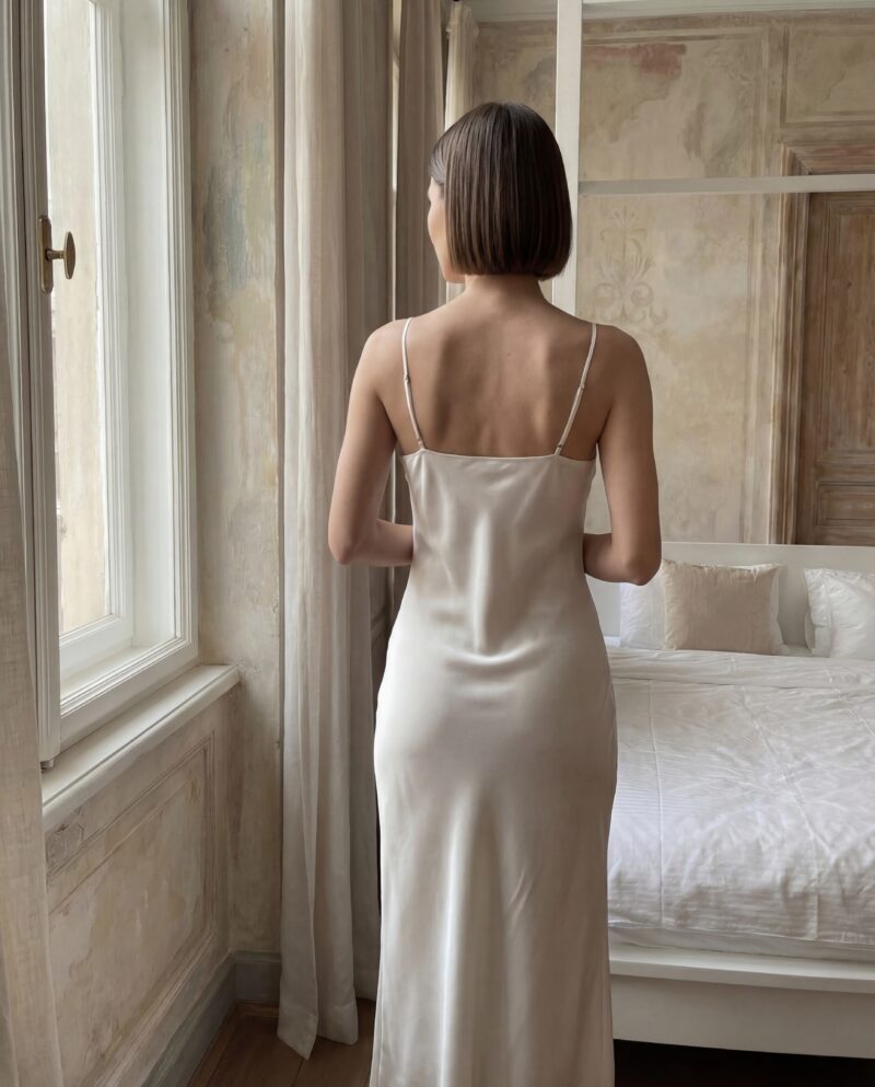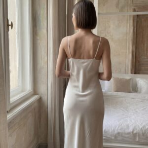 Została odszyta z wysokiej jakości, jedwabiu, skrojonego ze skosu, dzięki czemu pięknie układa się na sylwetce. Delikatne ramiączka pięknie eksponują dekolt.
