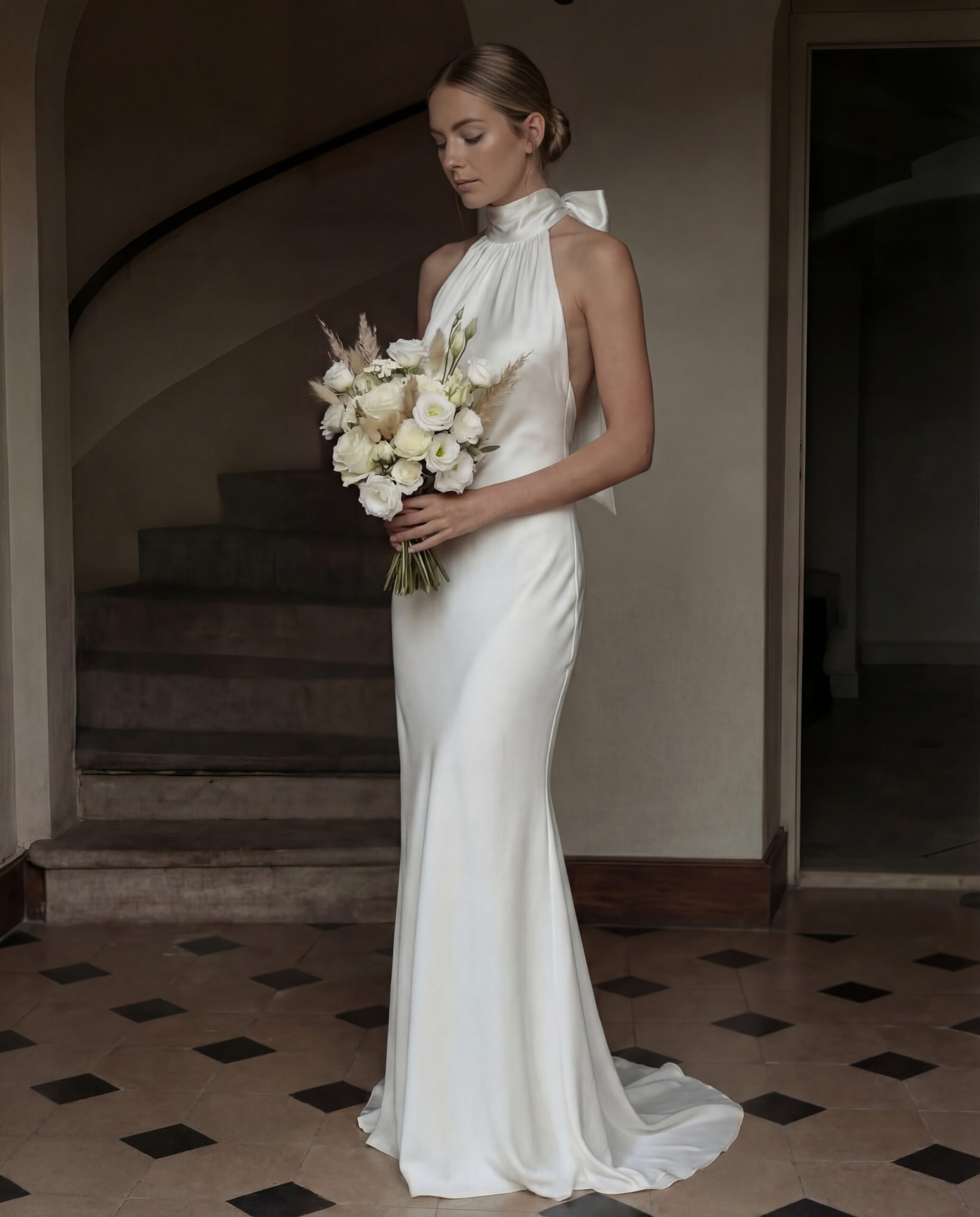 Została odszyta z wysokiej jakości, jedwabiu, skrojonego ze skosu, dzięki czemu pięknie układa się na sylwetce. Delikatne ramiączka pięknie eksponują dekolt.