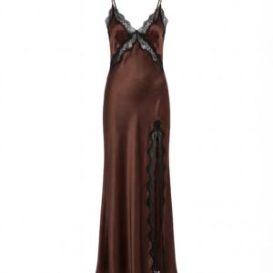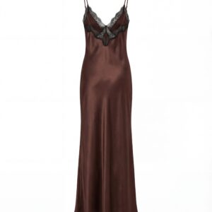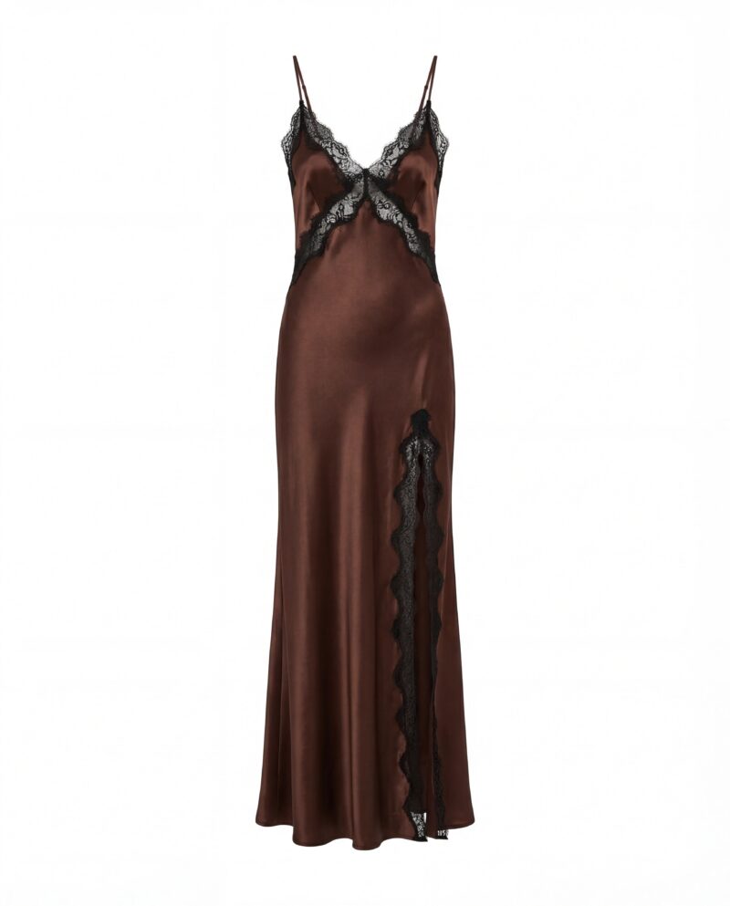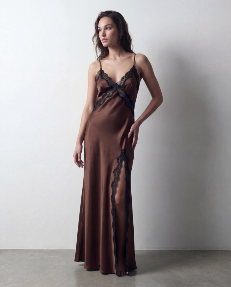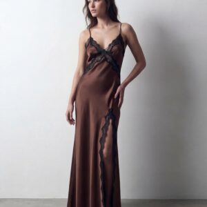Uszyta z naturalnej jedwabnej satyny, miękko opływa figurę, a kontrastowa koronka delikatnie zaznacza linię biustu oraz nogi, tworząc efekt lekkości i kobiecej elegancji. Głębokie wycięcie na plecach oraz regulowane ramiączka nadają sukience zmysłowy, ale niewymuszony charakter.