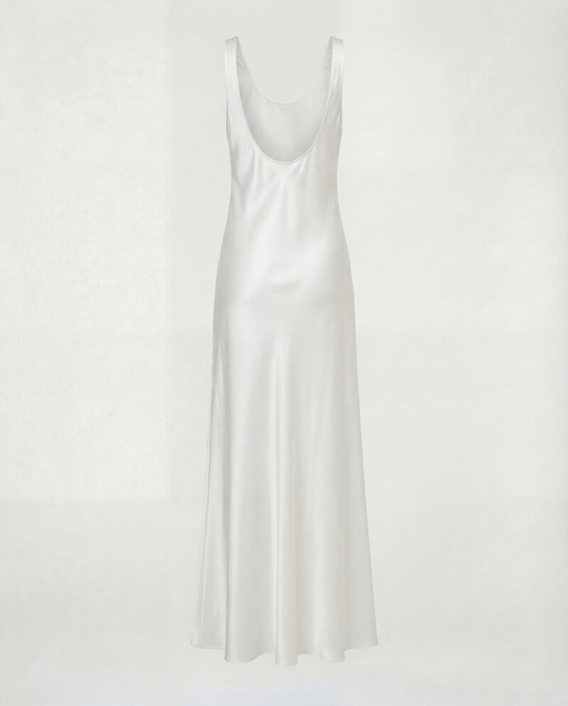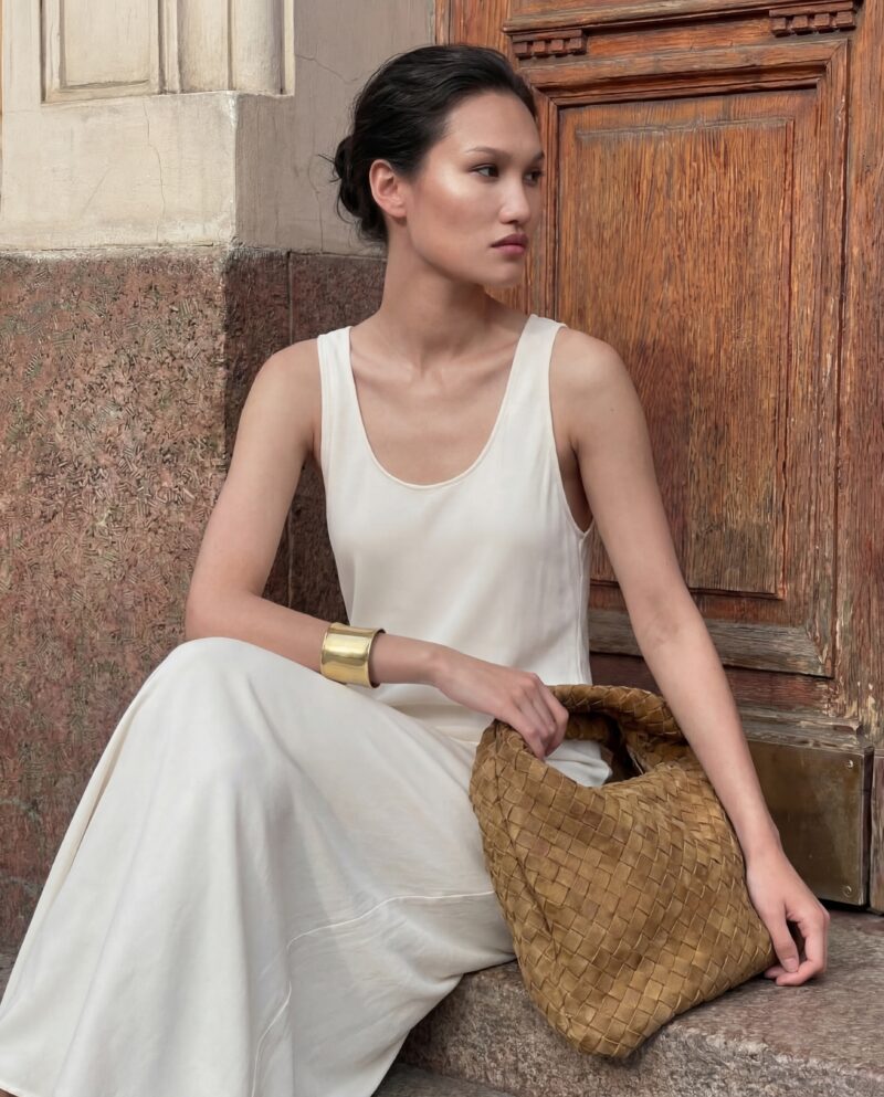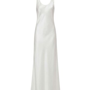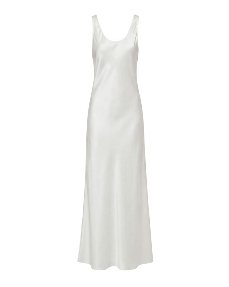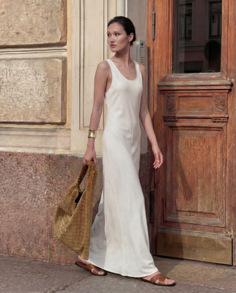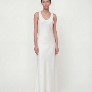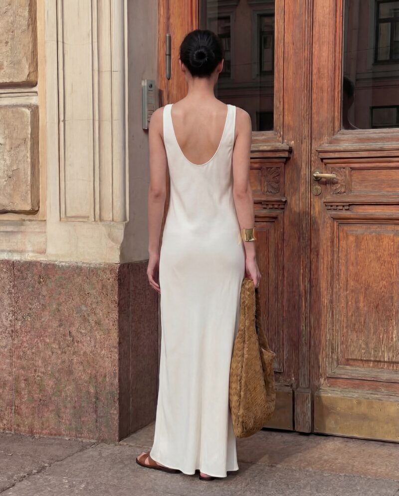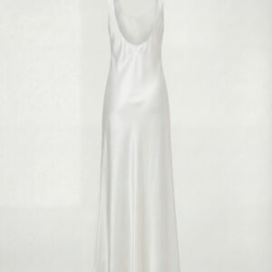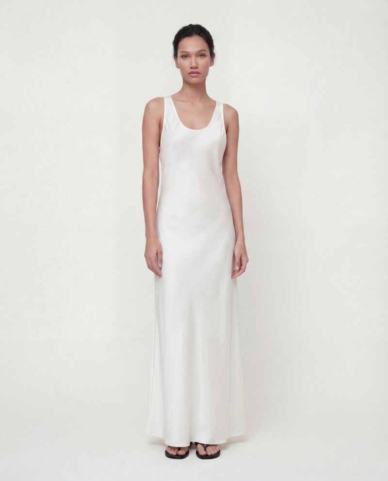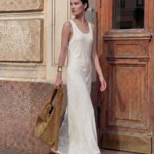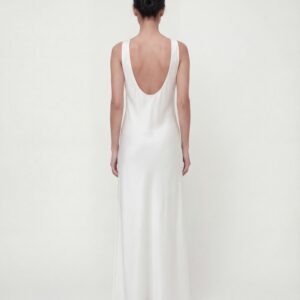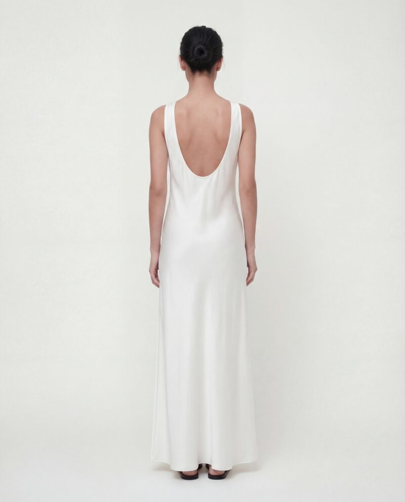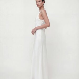 Uszyta z naturalnej satyny jedwabnej, miękko układa się na ciele, pracując z ruchem i światłem. To sukienka, która nie potrzebuje dodatków, ale doskonale je przyjmuje – od płaskich sandałów i dużej torby na dzień, po biżuterię i delikatne obcasy na wieczór.