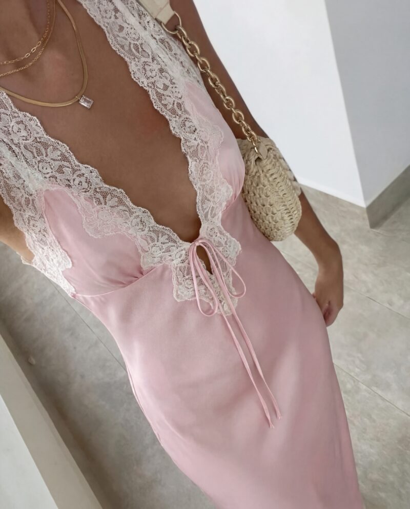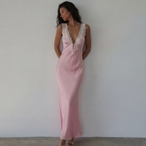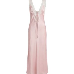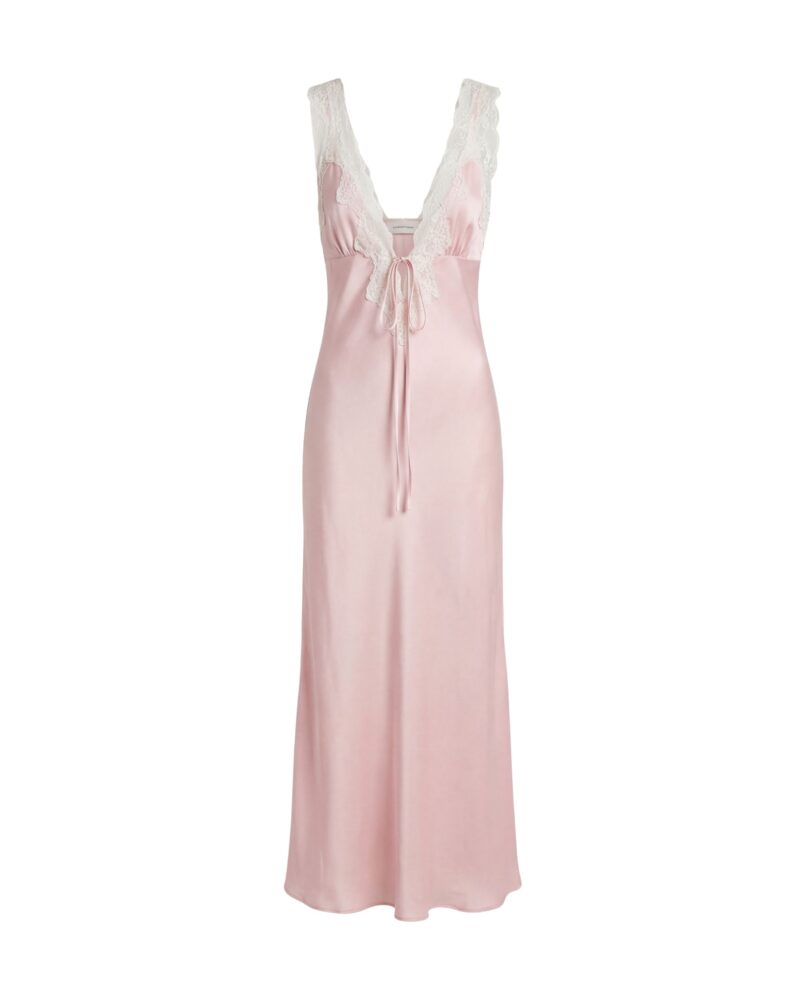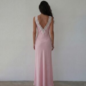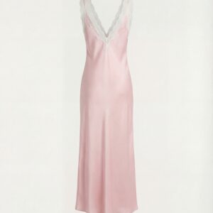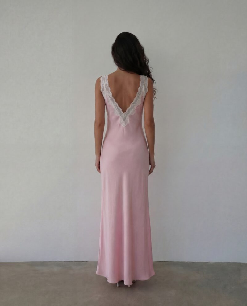 Uszyta z jedwabnej satyny o miękkim połysku, swobodnie spływa po sylwetce, podkreślając jej naturalną linię. Pudrowy odcień różu nadaje całości subtelności, a finezyjna koronka przy dekolcie i na plecach wprowadza element intymnej elegancji.