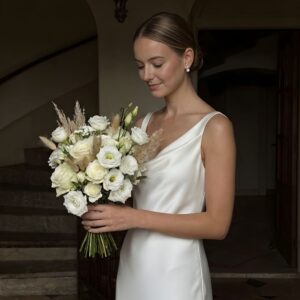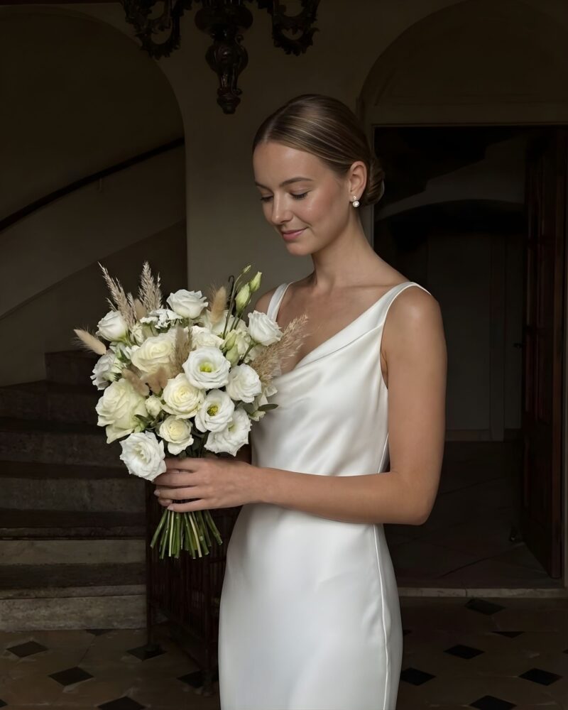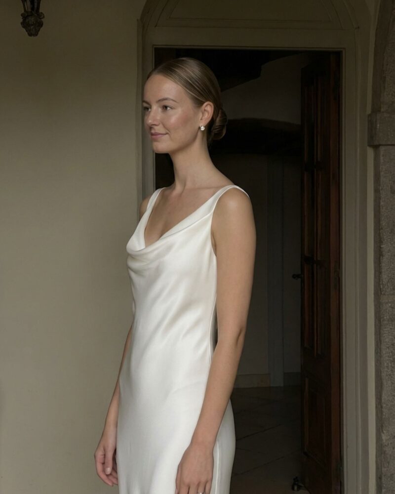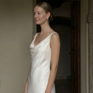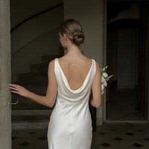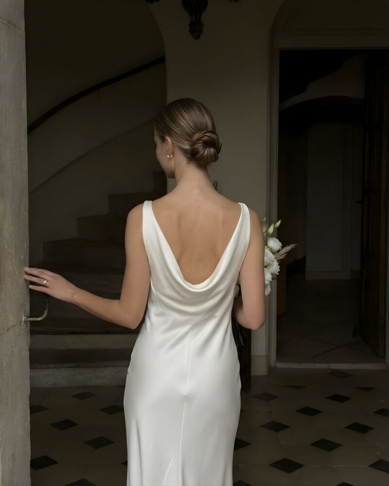 Klasyczna, a zarazem pełna subtelnej zmysłowości – ta jedwabna suknia ślubna została zaprojektowana z myślą o pannach młodych, które cenią ponadczasową elegancję i wyrafinowany minimalizm.