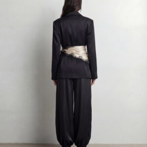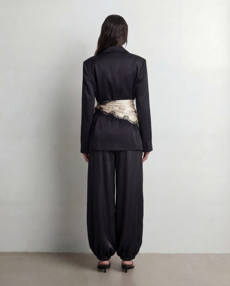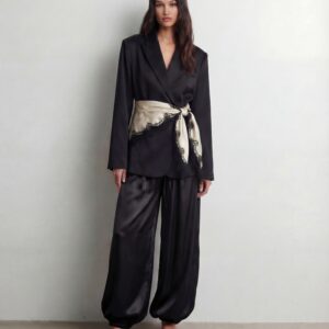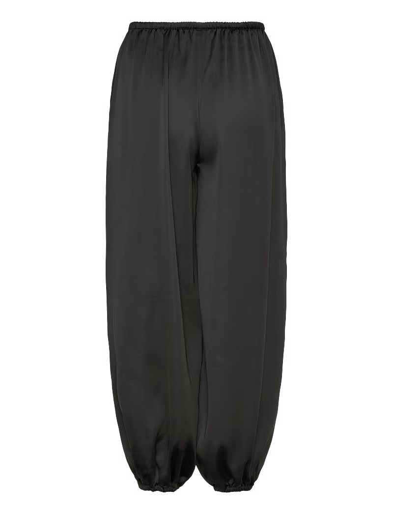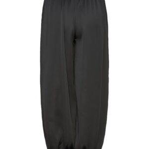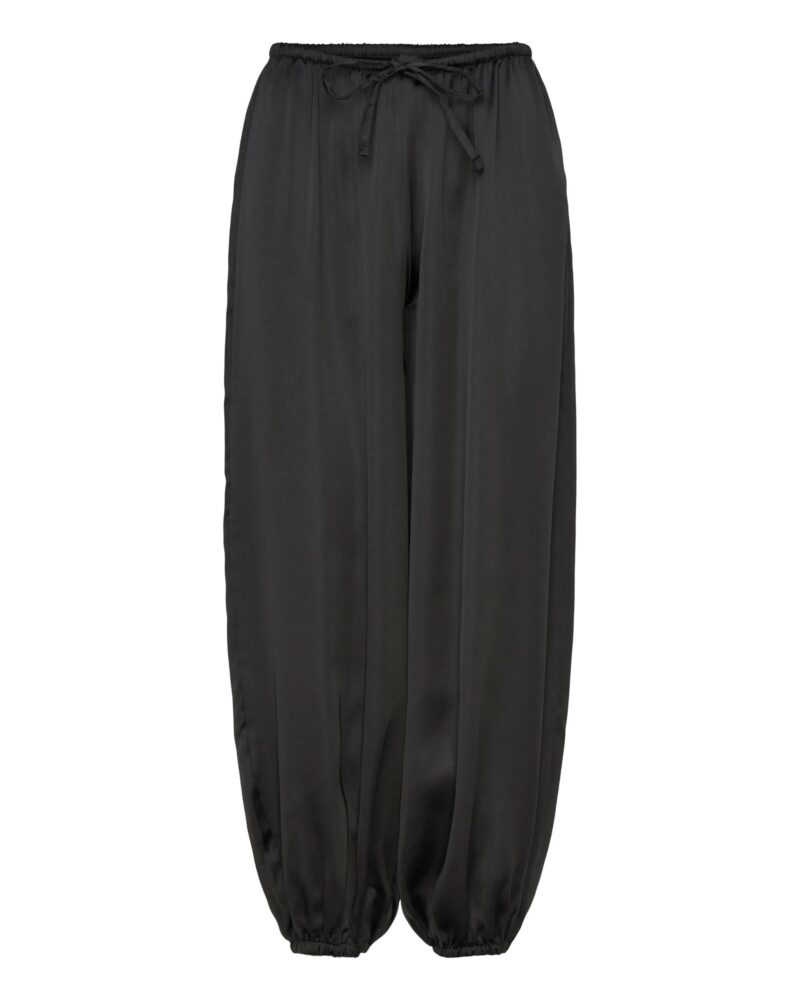 Uszyte z lejącej, luksusowej jedwabnej satyny, zachwycają objętościową linią nogawek i subtelnym połyskiem tkaniny. Charakterystyczny balonowy krój nadaje sylwetce lekkości, jednocześnie budując wyraźny, modowy akcent. Elastyczna talia z delikatnym wiązaniem pozwala dopasować spodnie do ciała i nosić je zarówno wysoko w pasie, jak i bardziej swobodnie.