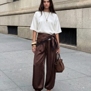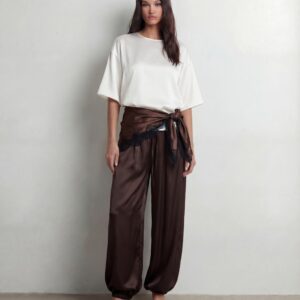 Uszyte z lejącej, luksusowej jedwabnej satyny, zachwycają objętościową linią nogawek i subtelnym połyskiem tkaniny. Charakterystyczny balonowy krój nadaje sylwetce lekkości, jednocześnie budując wyraźny, modowy akcent. Elastyczna talia z delikatnym wiązaniem pozwala dopasować spodnie do ciała i nosić je zarówno wysoko w pasie, jak i bardziej swobodnie.