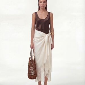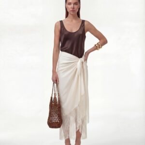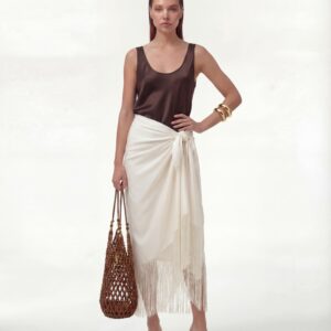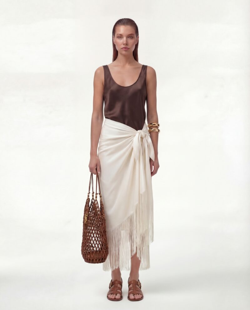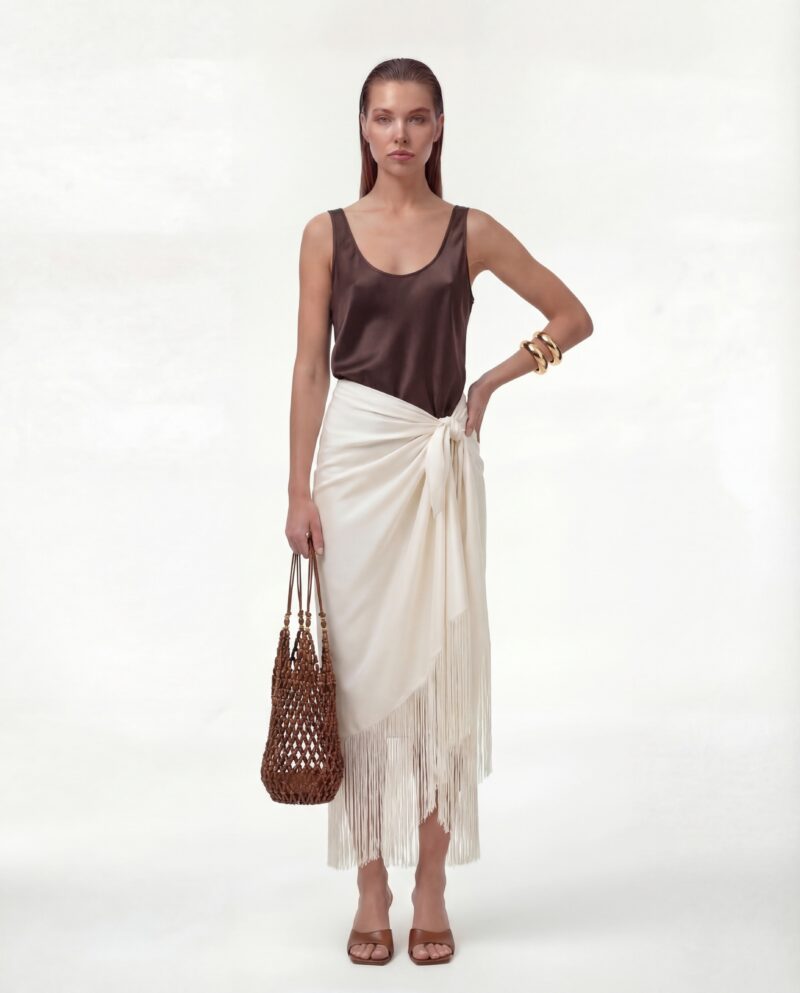 Jedwabny sarong Ecru Muse to lekka, zmysłowa forma, która porusza się razem z ciałem. Uszyty z miękkiego, szlachetnego jedwabiu, subtelnie otula sylwetkę i pozwala na dowolne wiązanie — w pasie, na biodrach lub asymetrycznie, w zależności od nastroju i okazji.
