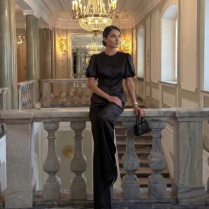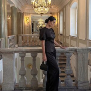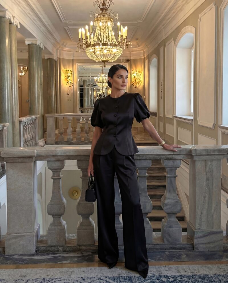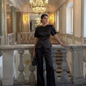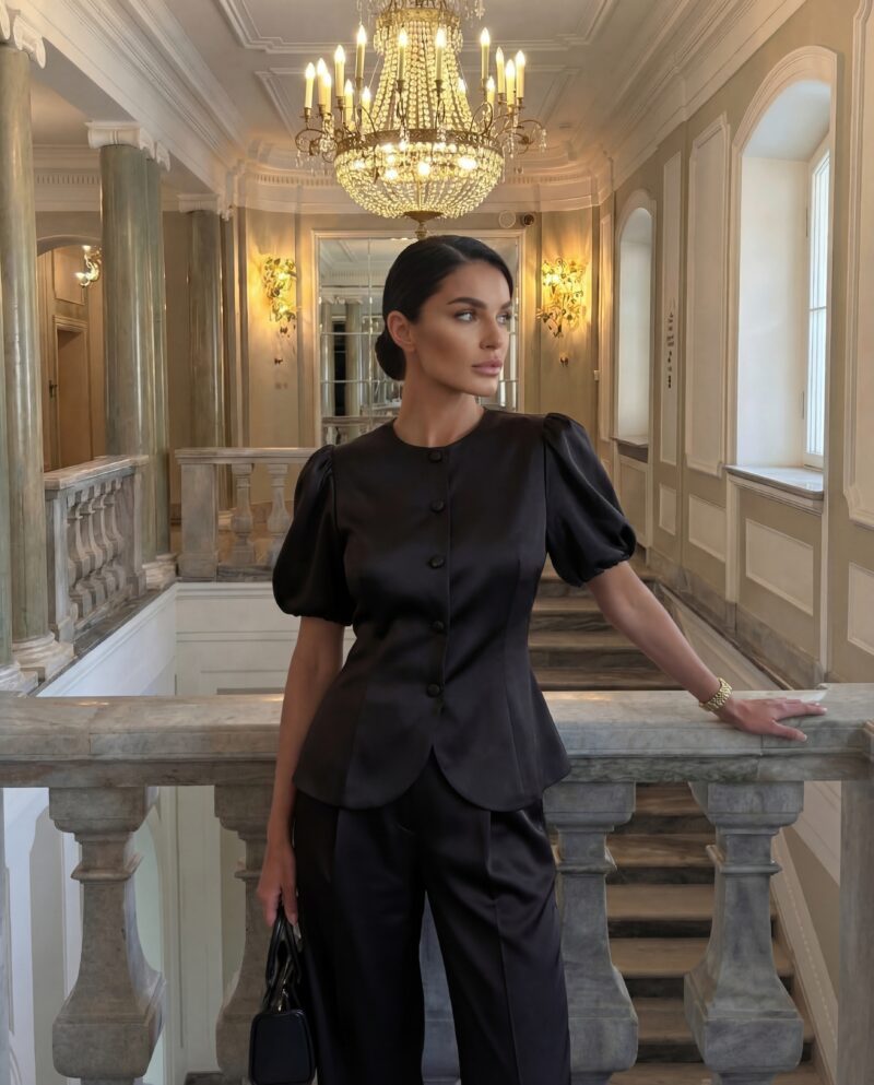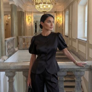 Elegancki żakiet wykonany w całości z luksusowej tafty jedwabnej, który zachwyca subtelnym połyskiem i perfekcyjnym krojem. Model z krótkimi, lekko bufowanymi rękawami i oblekanymi jedwabiem guzikami to połączenie klasyki i nowoczesnej elegancji. Dopasowany krój pięknie podkreśla talię, a delikatnie zaokrąglone wykończenie nadaje całości lekkości i wyrafinowania.