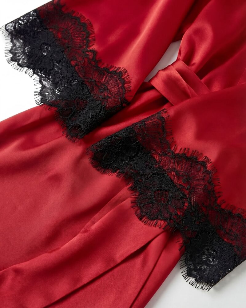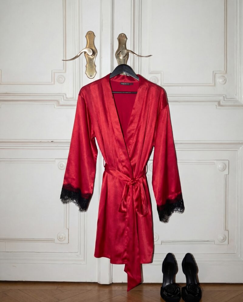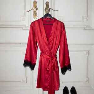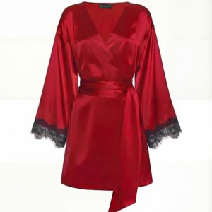 Uszyty z luksusowego, naturalnego jedwabiu o satynowym połysku, miękko otula ciało i podkreśla kobiecą sylwetkę z niezwykłą subtelnością. Głęboka, walentynkowa czerwień symbolizuje namiętność, bliskość i emocje, a delikatna czarna koronka przy rękawach dodaje całości eleganckiej zmysłowości.