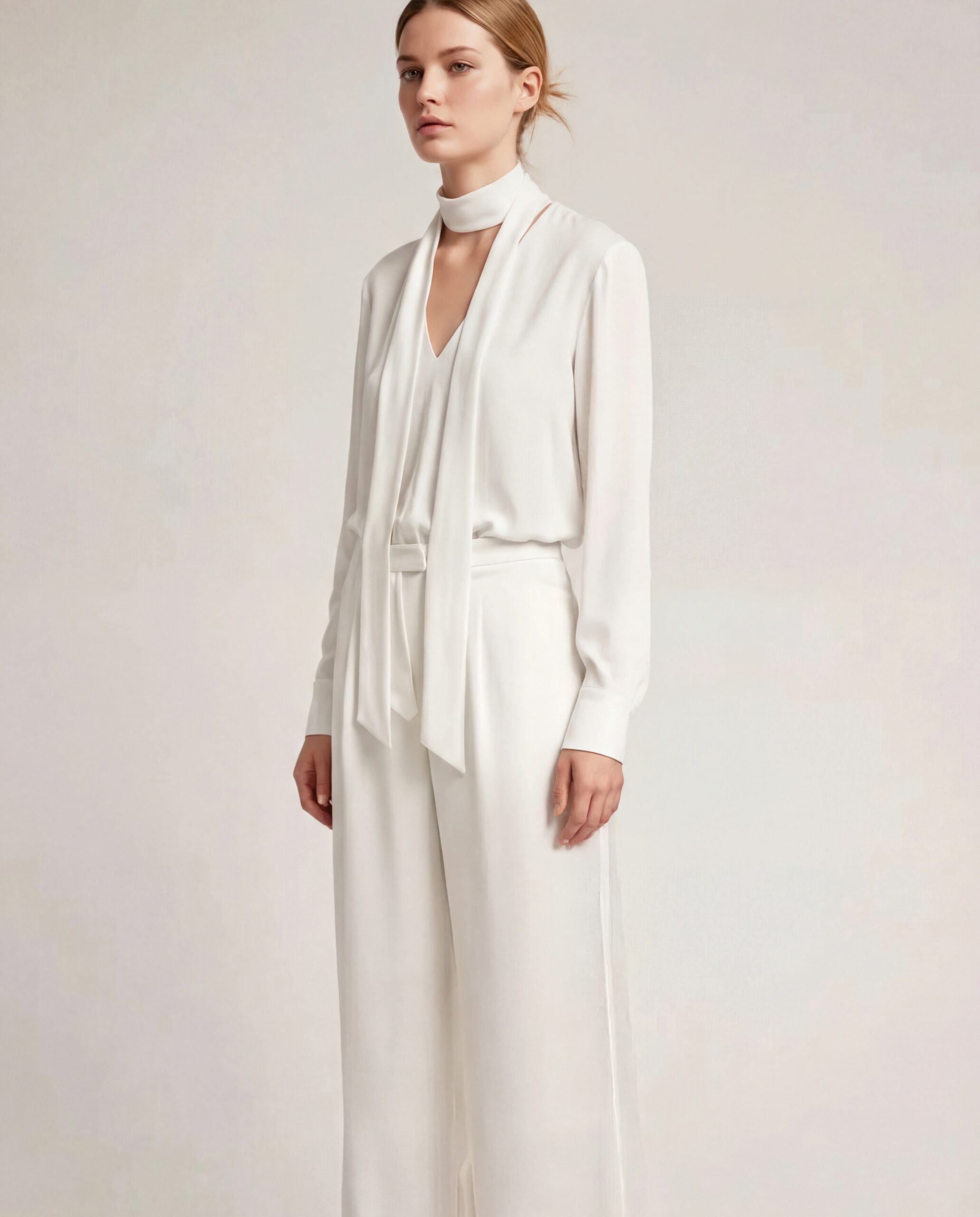 Te spodnie z jedwabnej satyny to elegancka propozycja, która łączy komfort z wyrafinowanym stylem. Wykonane z wysokiej jakości materiału, oferują subtelny połysk, który podkreśla ich luksusowy charakter. Model w klasycznej czerni z szerokimi nogawkami doskonale dopasowuje się do różnych stylizacji – zarówno tych na co dzień, jak i bardziej formalnych. Z przodu, dodatkowy detal w postaci szarfy nadaje im wyjątkowego charakteru. Tył spodni z eleganckim wykończeniem i prostej formie, zapewnia idealne dopasowanie. To doskonały wybór na wieczorne wyjścia lub ważne spotkania.