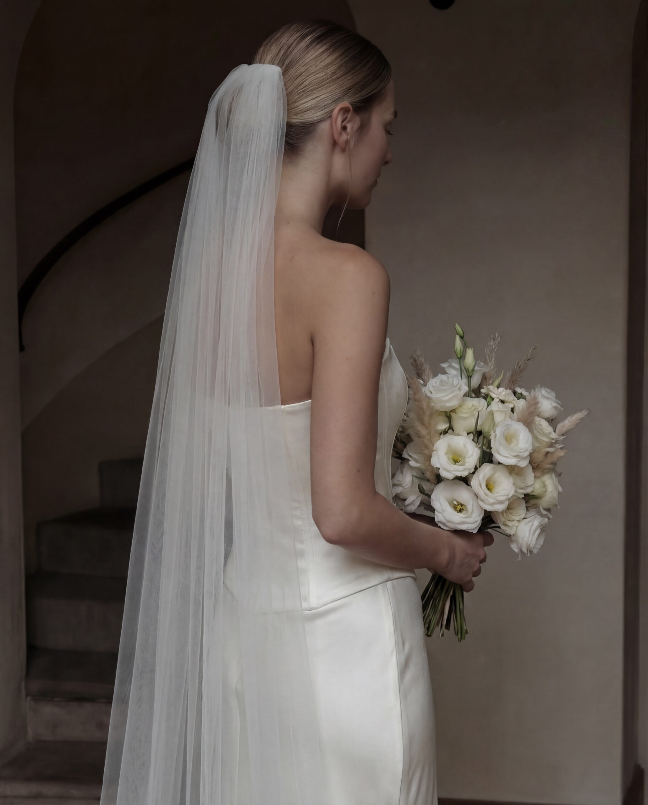 Długa jedwabna sukienka na ramiączkach z koronką i falbanką – Verona